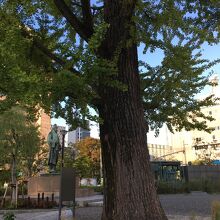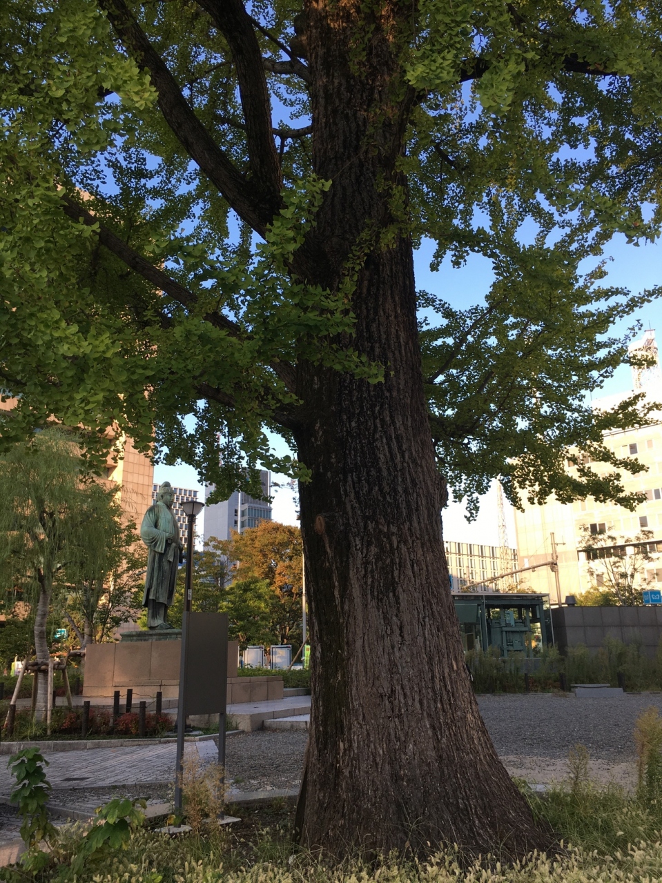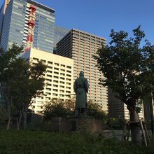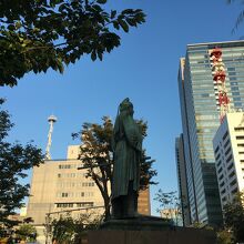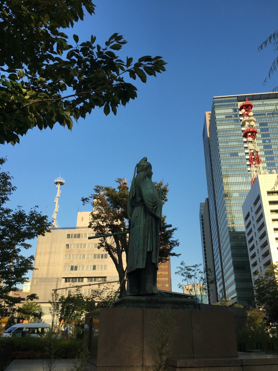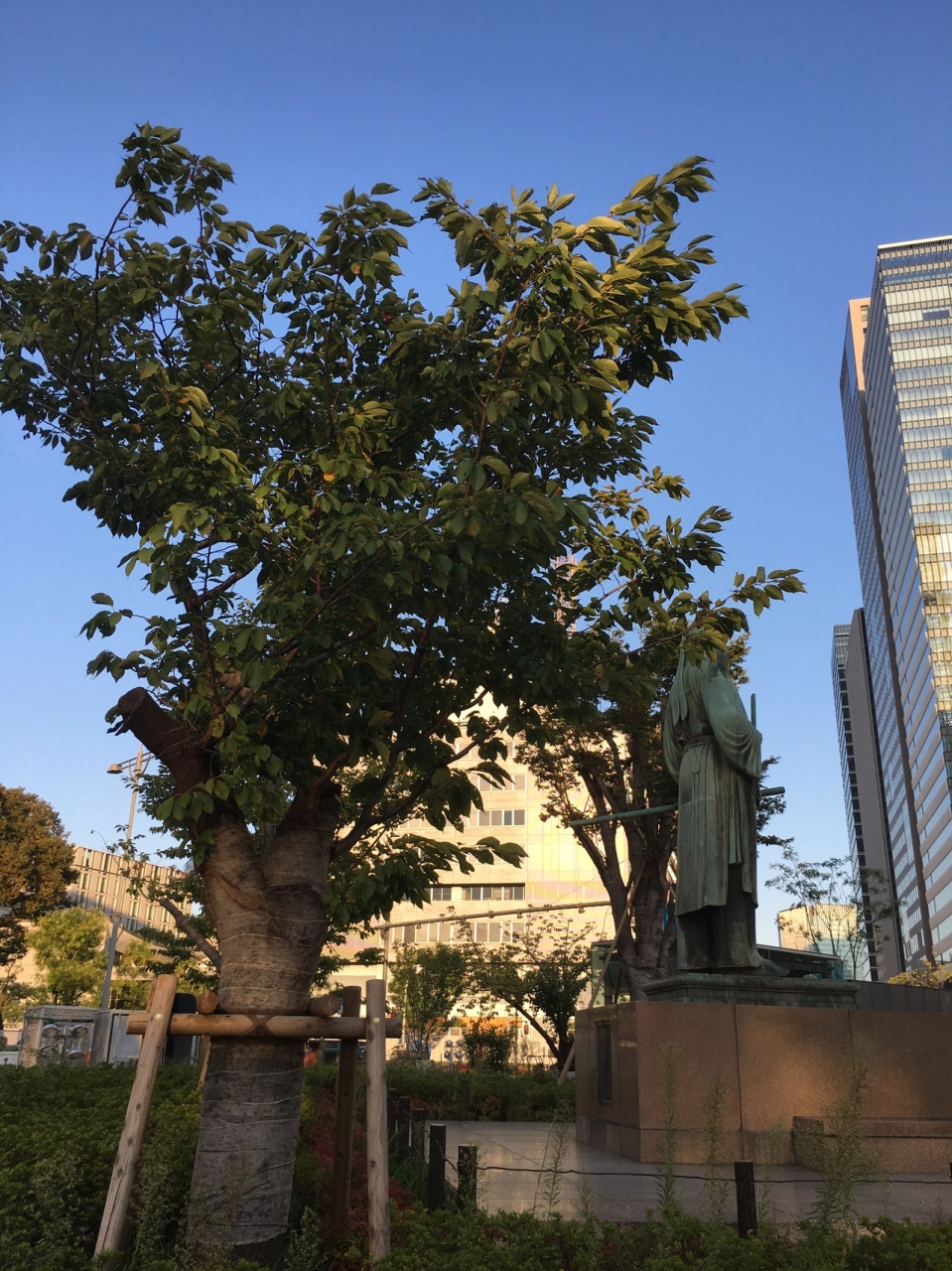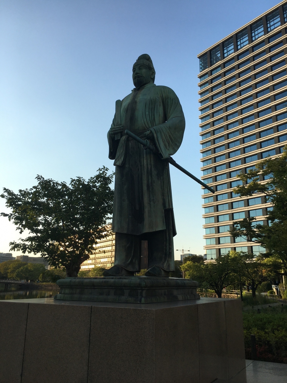 皇居に堀沿いに建っている大きな像でした。正装し刀を刺し、昔の中国の武人のような菅で髭を生やし土台にのっていました。ミニ公園内にあり皇居の方を向いていました。横には黒い下地に金色の説明文がありましたが読みにくいです。