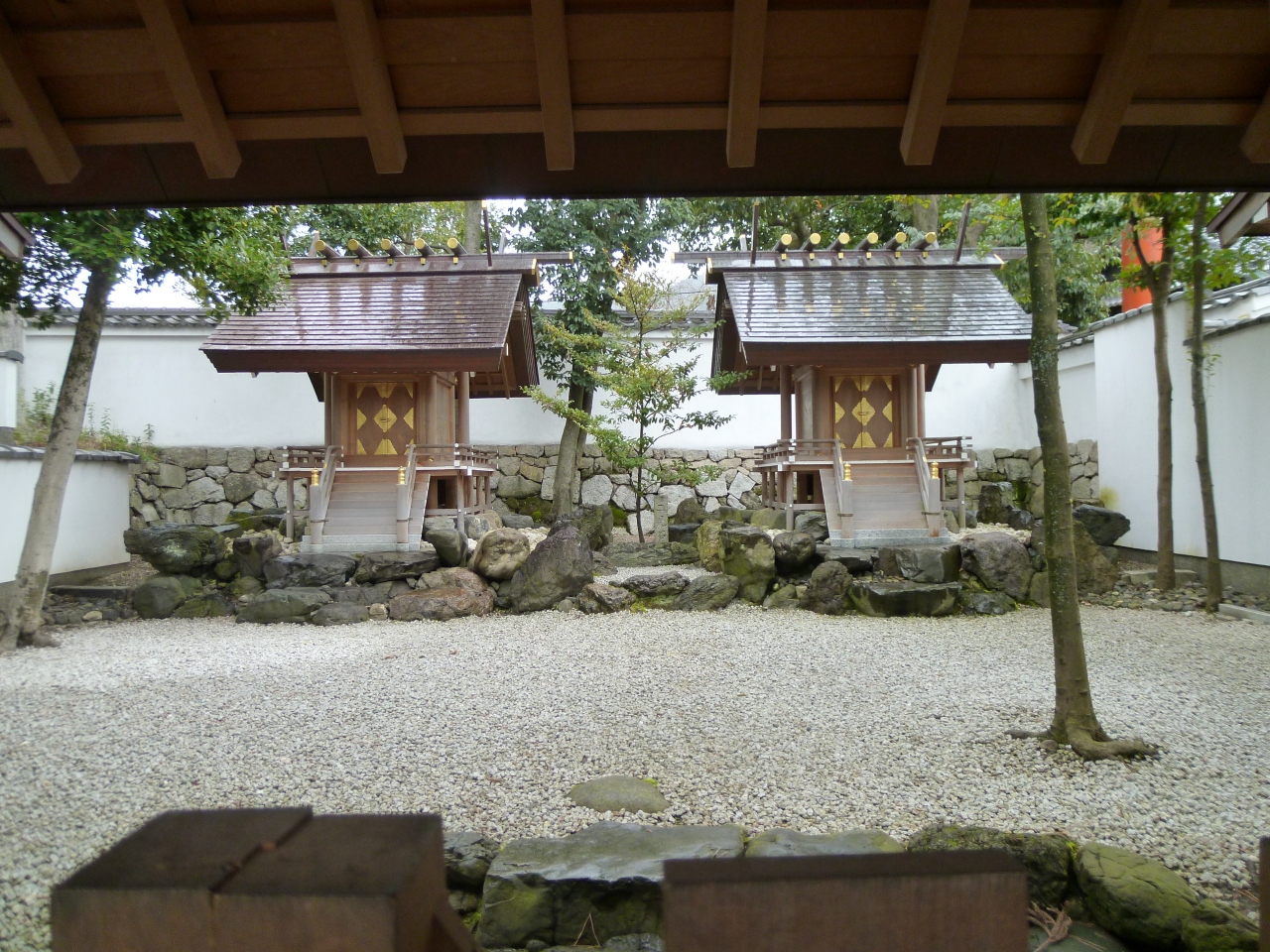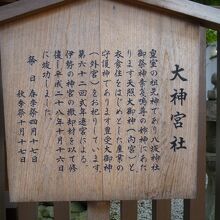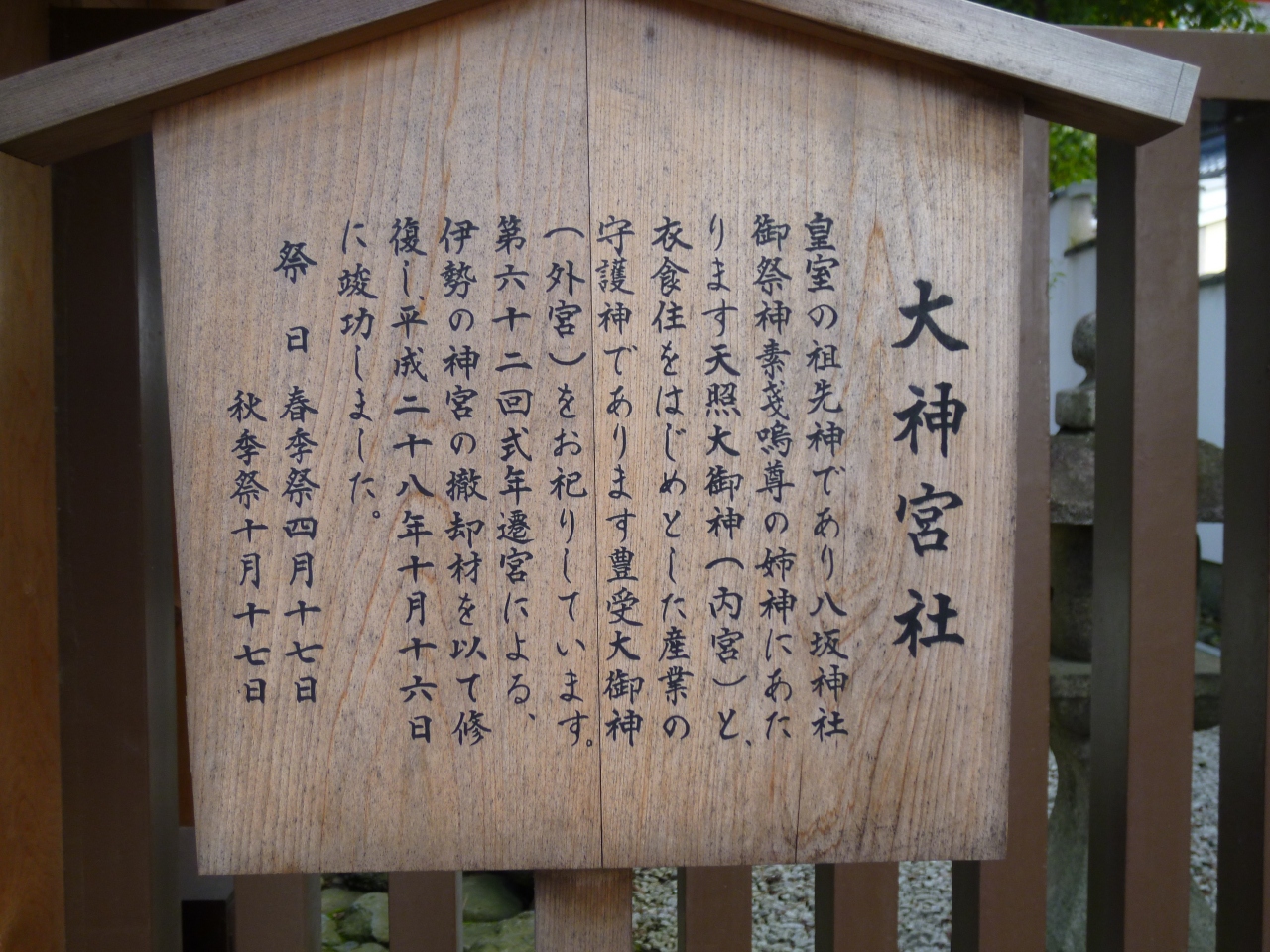 大神宮社は、八坂神社の末社で、本殿の南東に位置しています。祭神は、「天照大神」と「豊受大神」です。天照大神は皇室の祖神で、素戔嗚尊の姉神です。豊受大神は、天照大神の食事を司る神です。4月17日に春季祭、10月17日に秋季祭が行われます。私の印象は社に使用されている木がとてもいいものが使用されているなと思いました。また鳥居も木製でした。