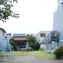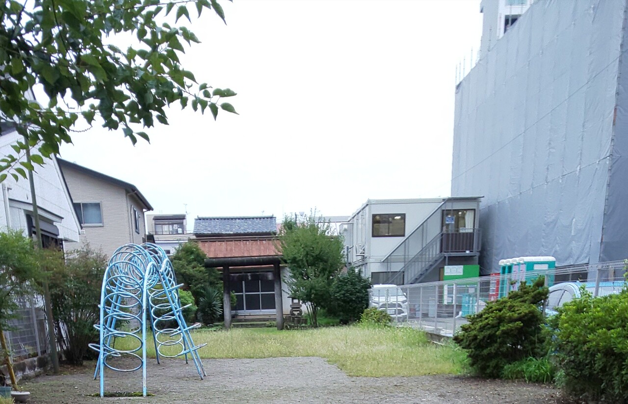 公園のような空き地の奥に仮の社殿があります。社殿とは言えないような小屋のような建物で、神様も早く立派な社殿がほしいだろうなと可哀想に思ってしまいます。