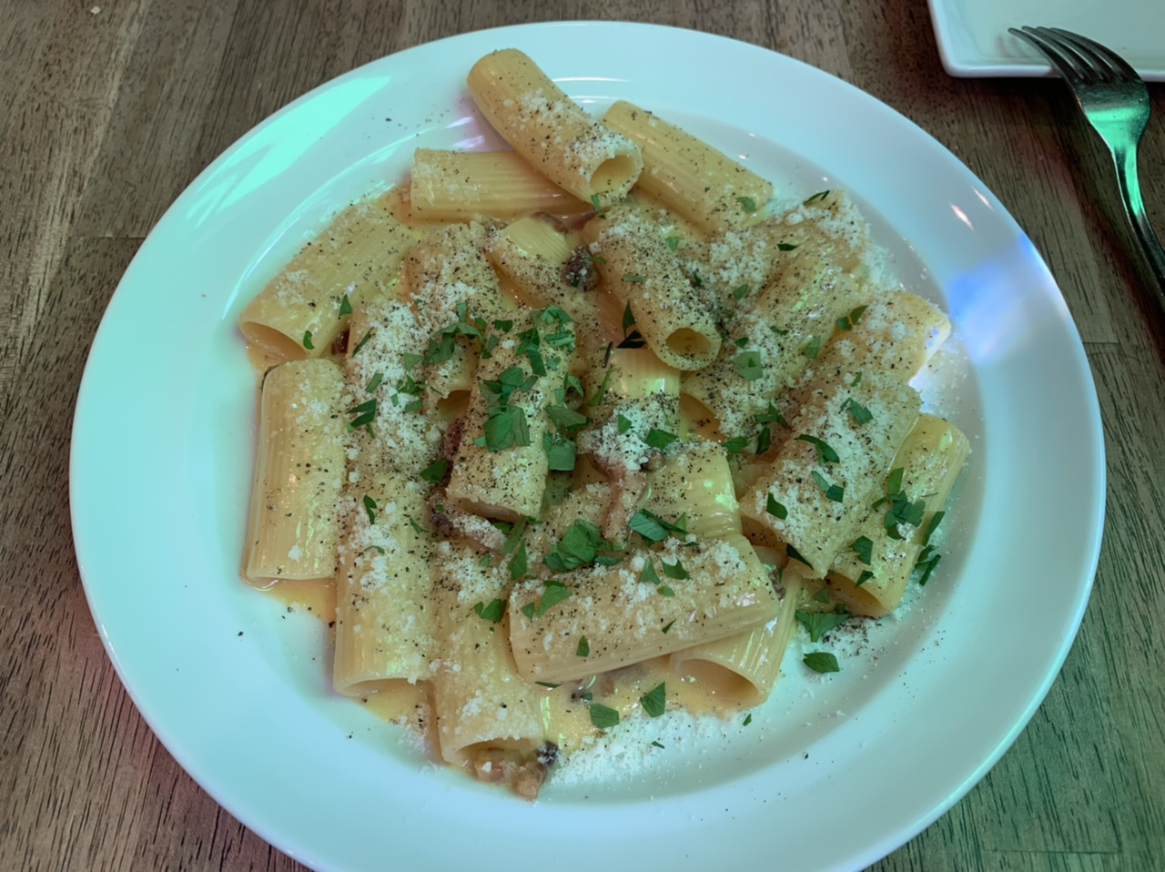 御殿場駅の近くにあるイタリア料理店です。ランチで利用しました。いただいたものはリガトーニのカルボナーラ。短く太い筒状になったパスタを使ったカルボナーラです。セットで、サラダ、デザート、ドリンクが付きます。デザートはパンナコッタでした。美味しかったです。店内の雰囲気も良いですね。