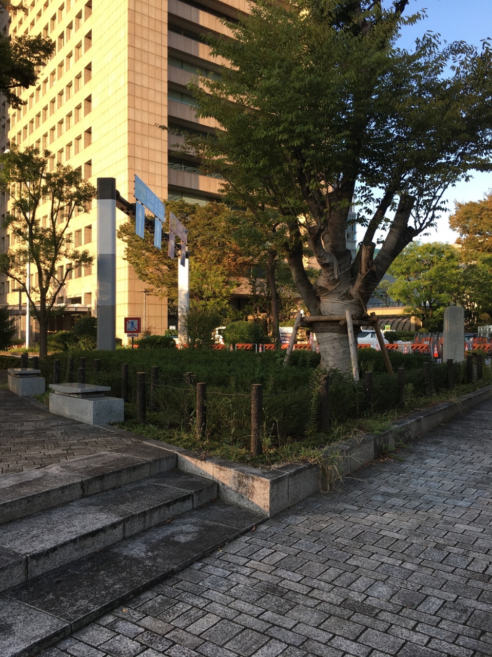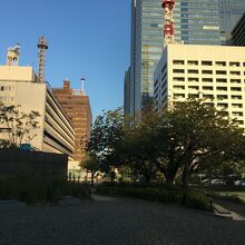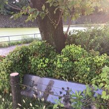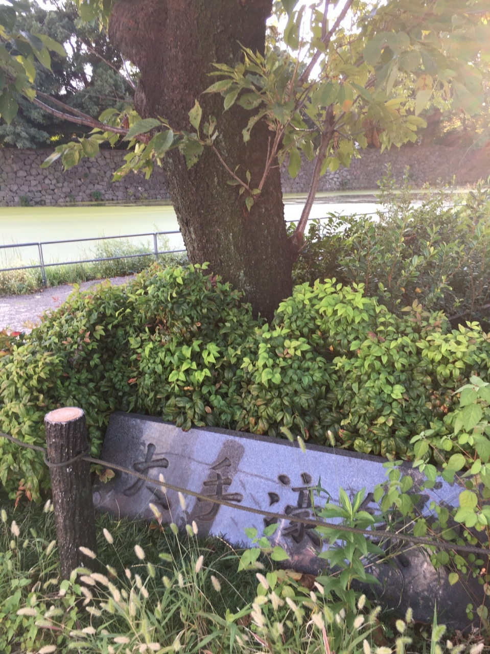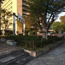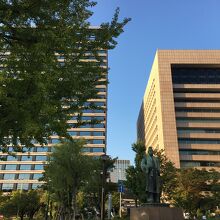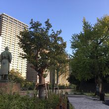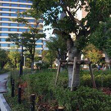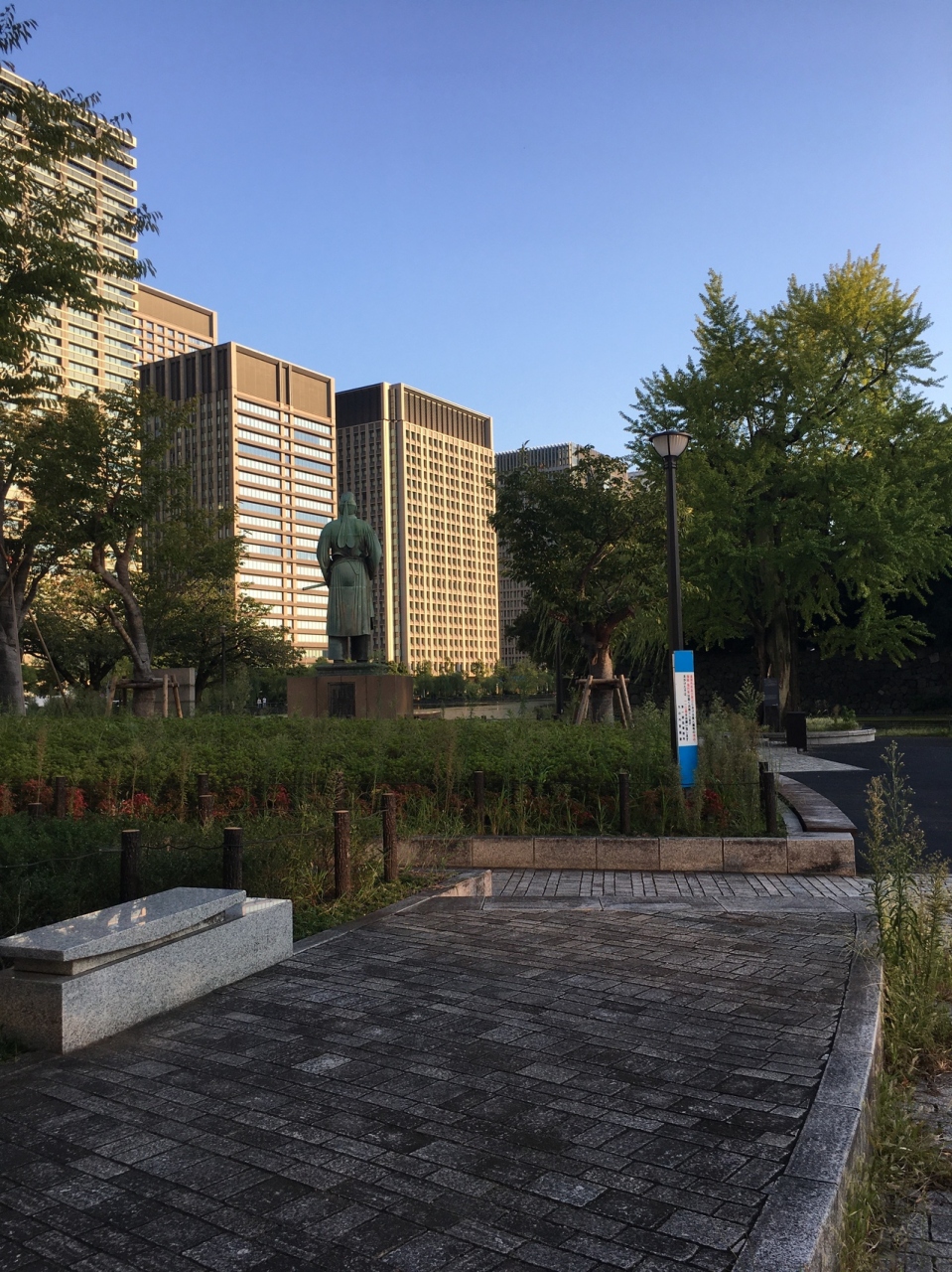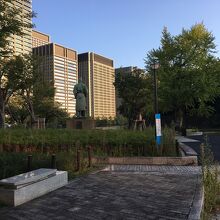 地下鉄竹橋駅の出入口の上にありました。皇居の堀に面したミニ公園と言った感じで、大きな像と大きなイチョウの木がありました。草木が生え、周りはビル群ですが、木々が整備されていて、舗装した場所と砂利の場所があります。