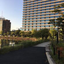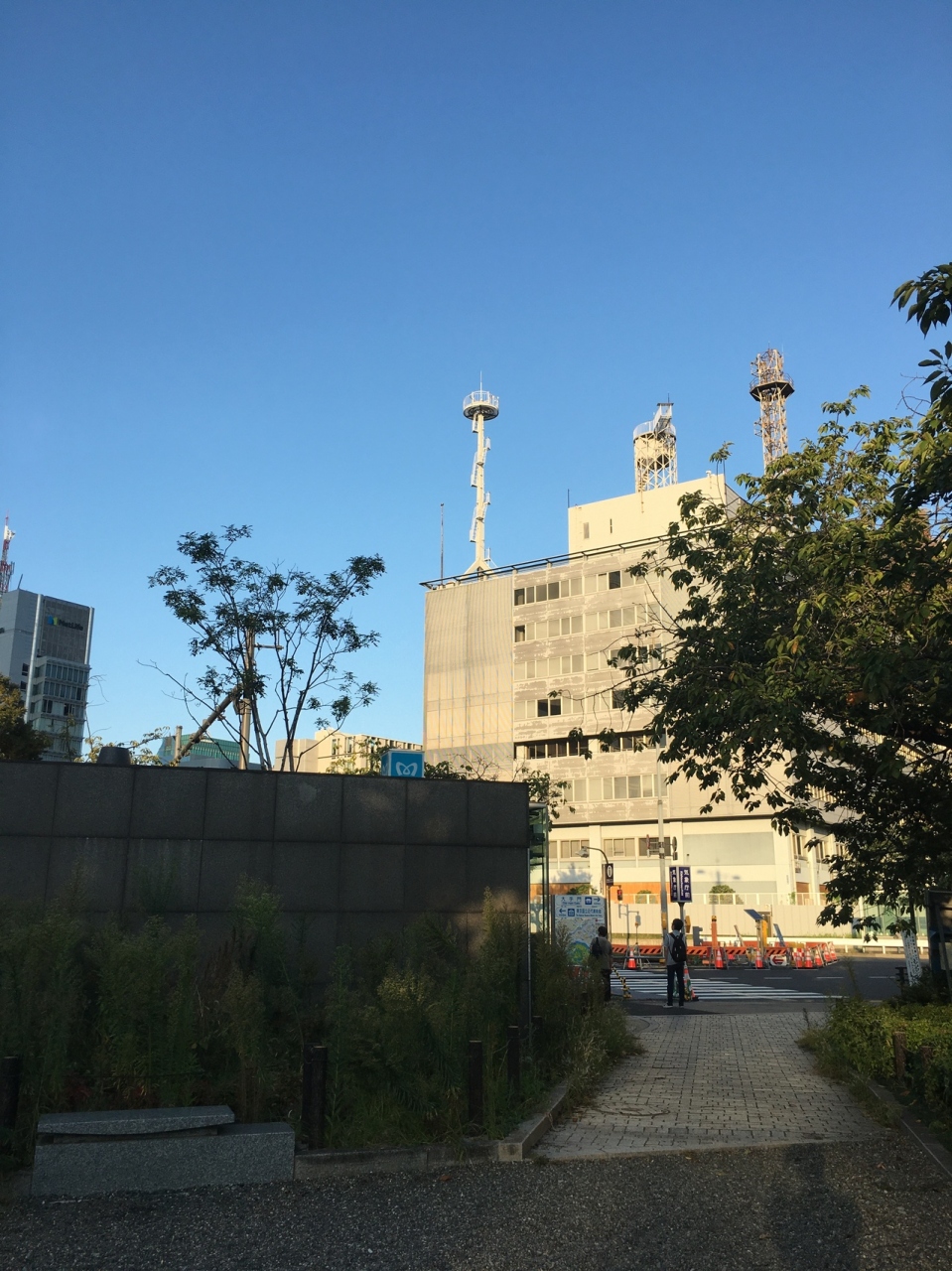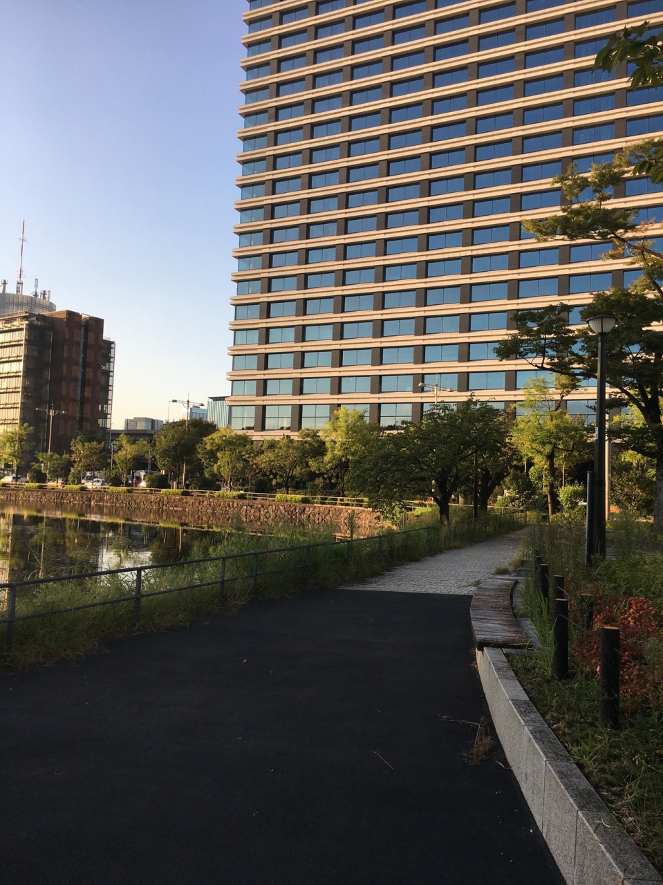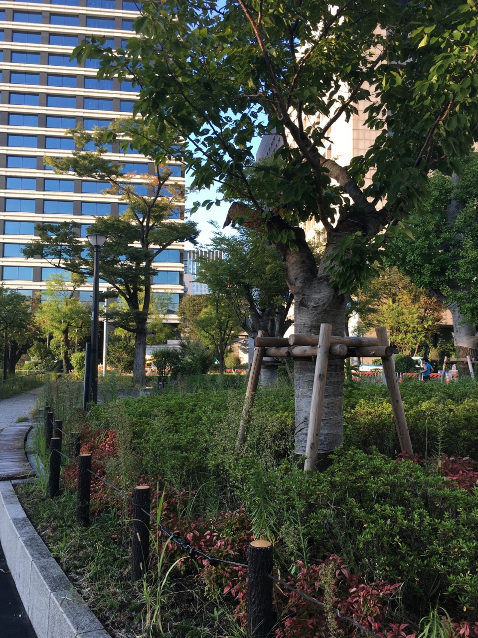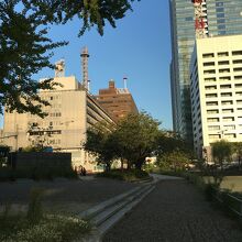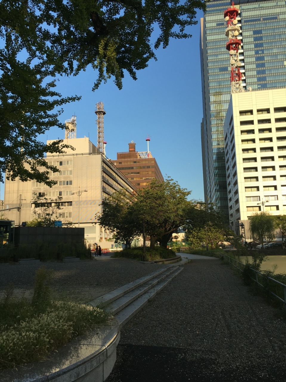 地下鉄竹橋駅の出入口の上にありました。皇居の堀に面したミニ公園と言った感じで、大きな像と大きなイチョウの木がありました。草木が生え、周りはビル群ですが、木々が整備されていて、舗装した場所と砂利の場所があります。