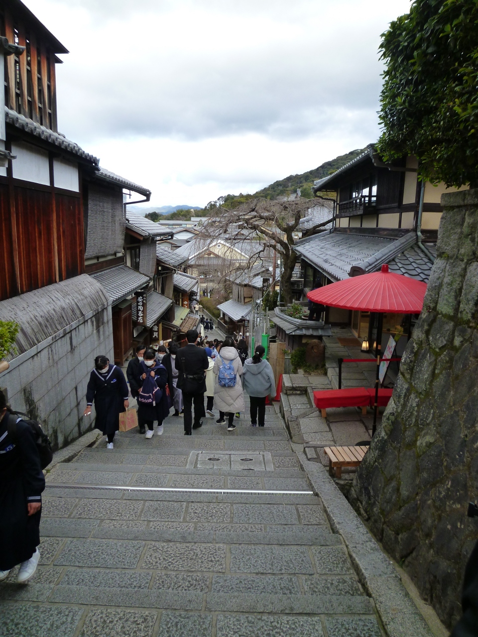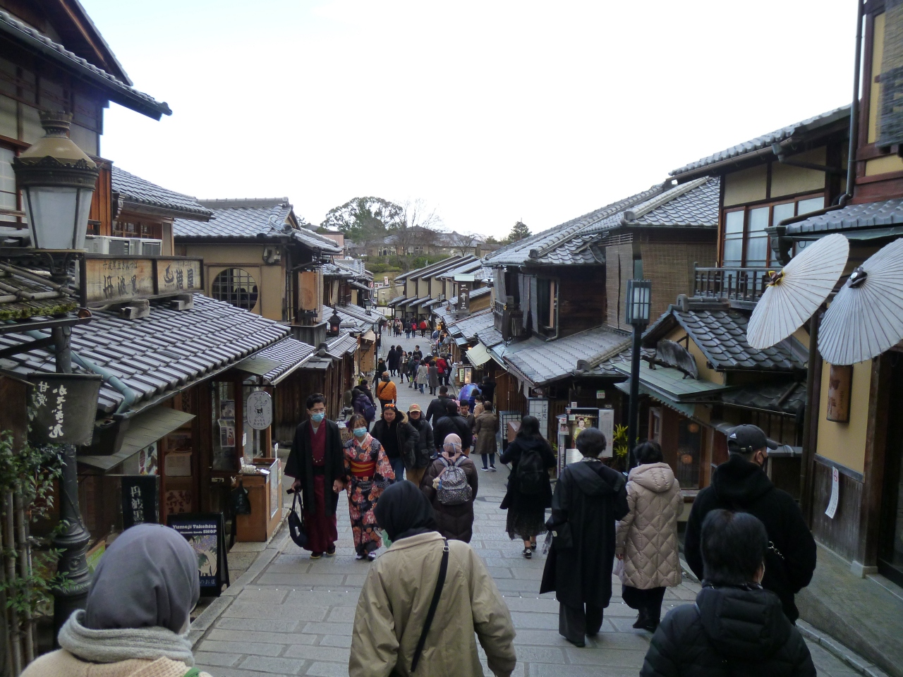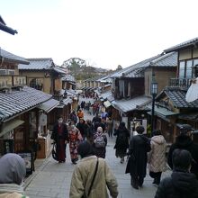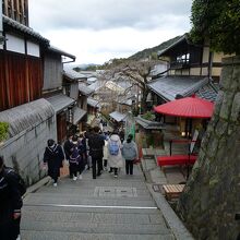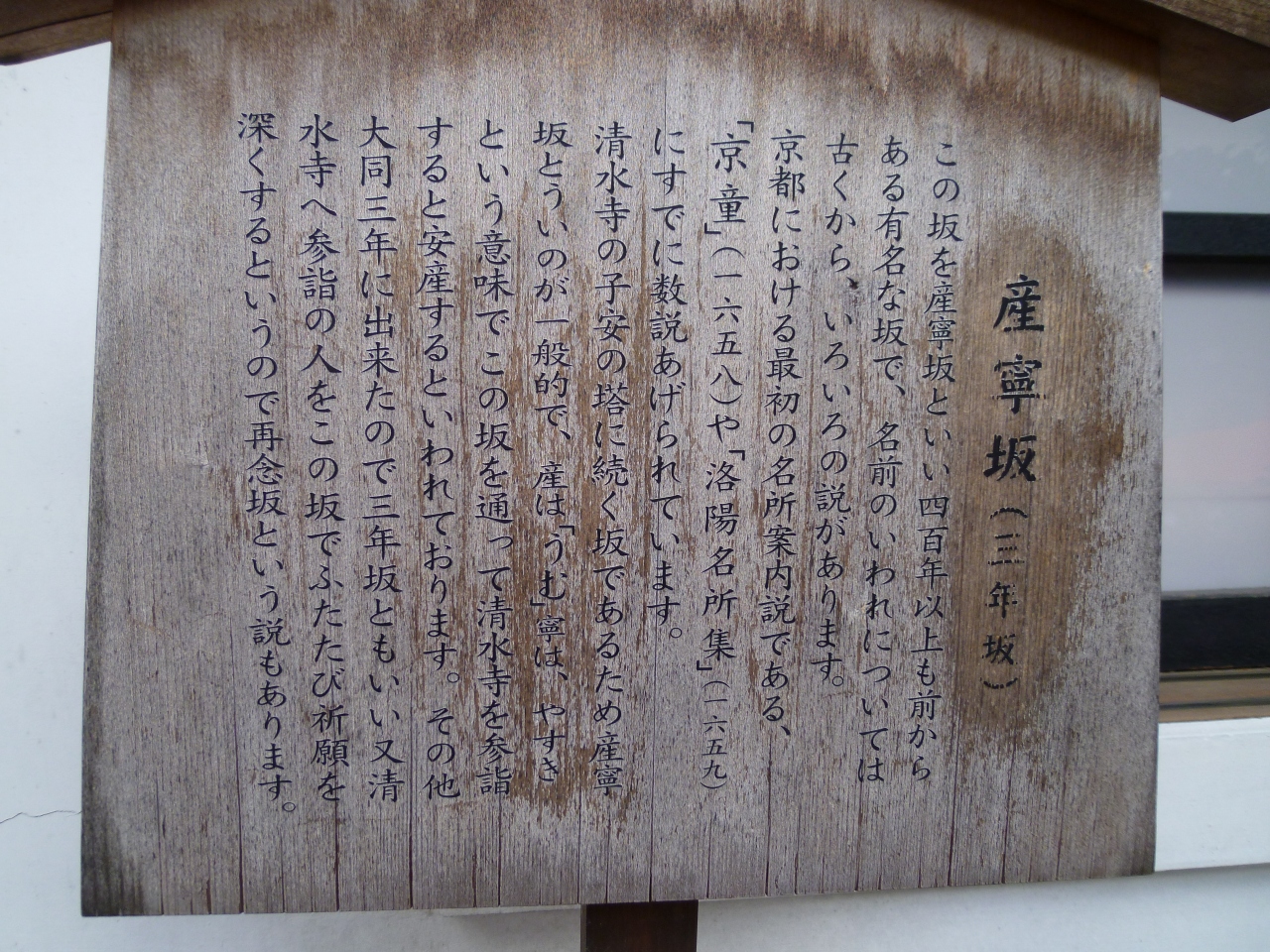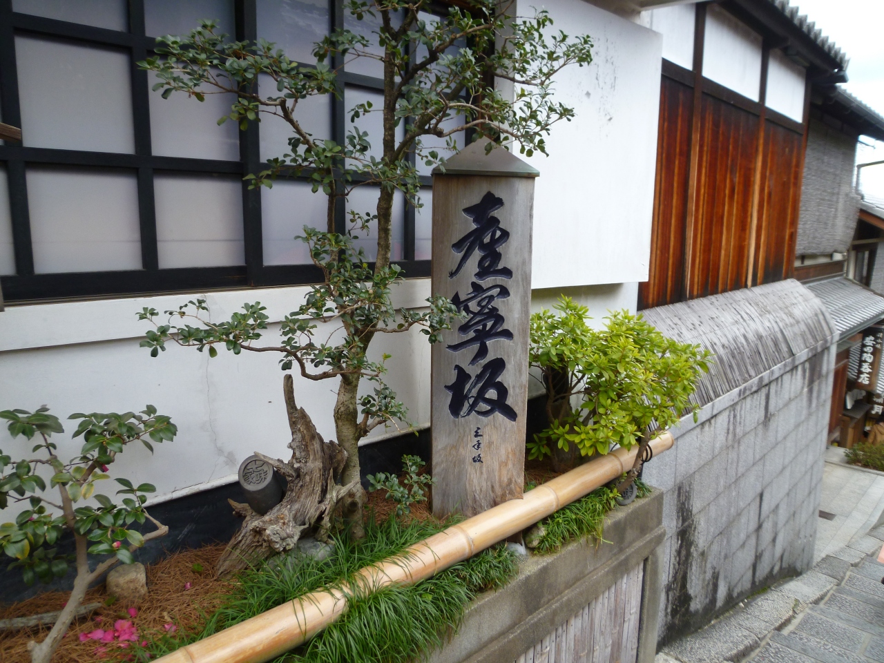 産寧坂は、諸説ありますが、豊臣秀吉の正妻(ねね)が子供の誕生を念じて坂をあがり、清水寺にお参りしていたことからその名がついたとされています。東山の観光地として有名で、重要伝統的建造物群保存地区に選定されています。二年坂を介して北にある八坂神社、円山公園、高台寺、法観寺と南にある清水寺を結んでいるため、観光客が絶えず、土産物店や料亭が並んでいます。私がこの付近を観光する場合には八坂神社から清水寺へ向うことが多いので、必ず産寧坂を利用します。通り沿いにはお店も多いのでいつも目新しいものを探しながら、観光しています。