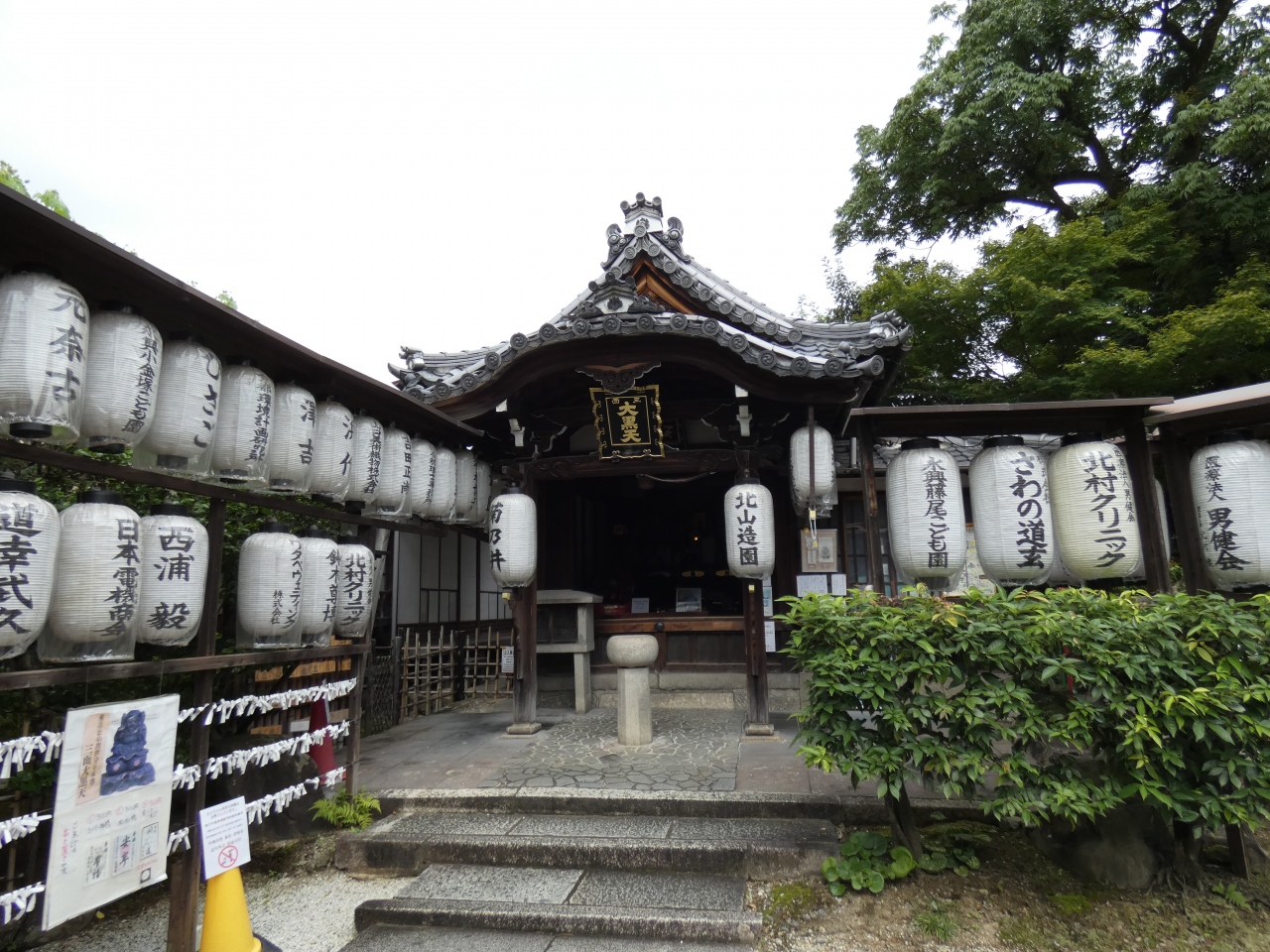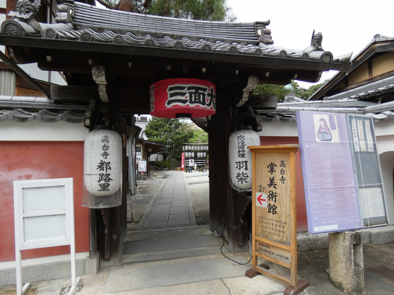 高台寺の西側、ねねの道沿いの白壁の洛市ねねショッピングモールの横に位置する三面大黒天。秀吉の出世守り本尊として伝わります。金運の神「大黒天」・武運の神「毘沙門天」・芸術の神「弁財天」の三天合体の強力な像です。御利益ありそうですね。高台寺塔頭寺院「圓徳院」の境内だそうです。