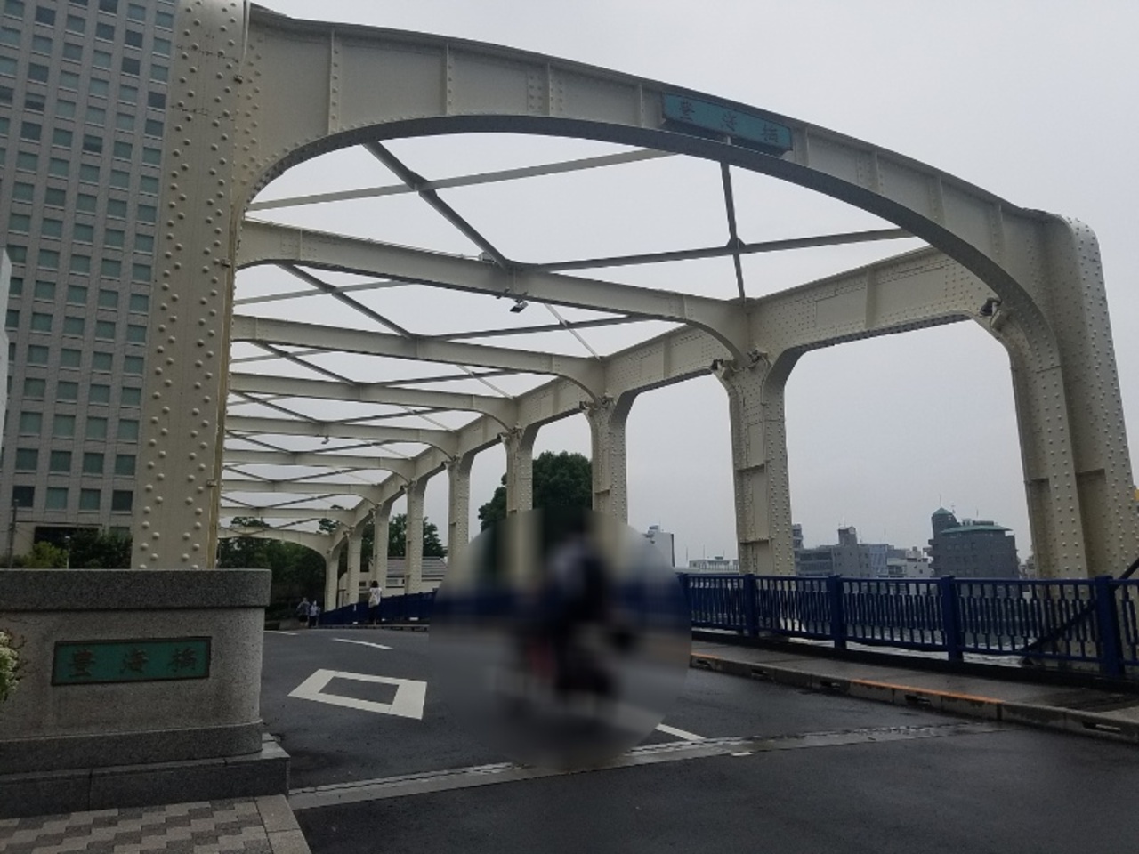 茅場町駅から永代通りを東にずっと歩いて永代橋の前で左手に見えたので行ってみました。日本橋川に架かっていて無骨なデザインセンスを感じる橋です。隅田川に架かる永代橋とは直角のような位置関係なのでこの橋からは45度ぐらいの角度のきれいな永代橋が見られました。