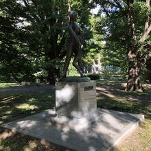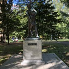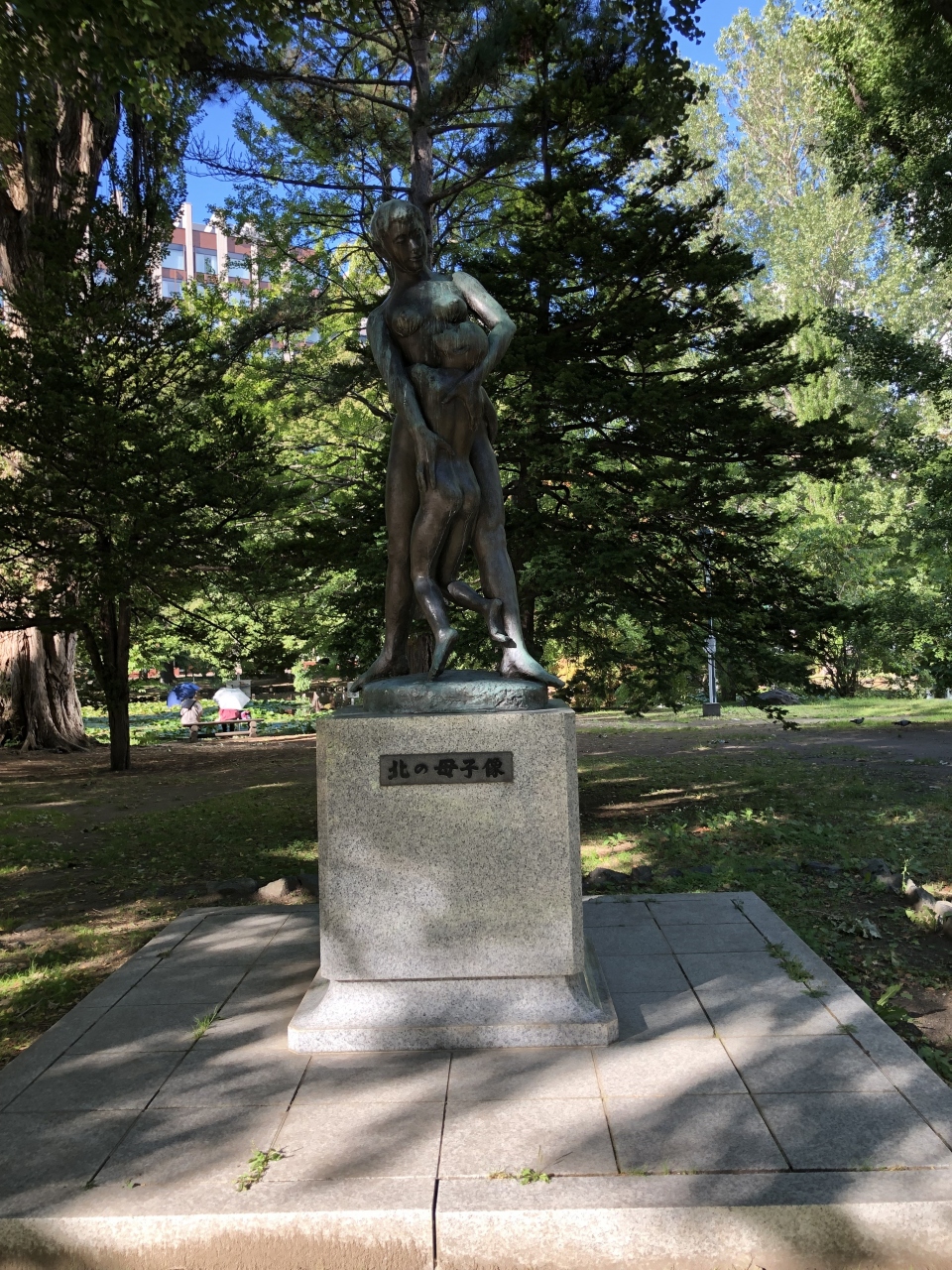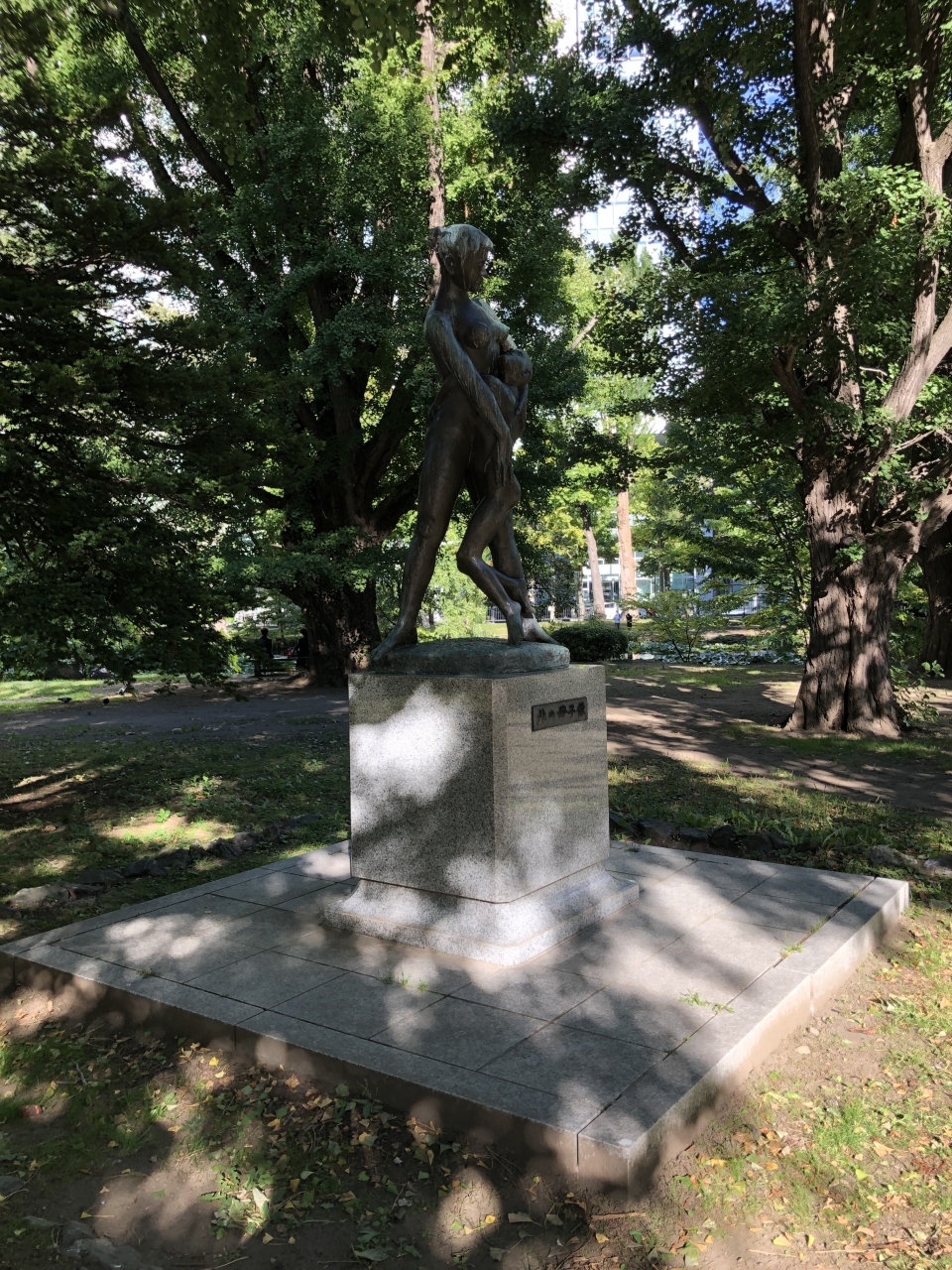 北海道庁旧本庁舎の前庭を散策している時に、こちらの像を見つけました。建物に向かって右側にある池の前に設置されています。子供が母親に抱き着いている像です。表情や動作から母の愛情が伝わってくるもので、心が和みました。