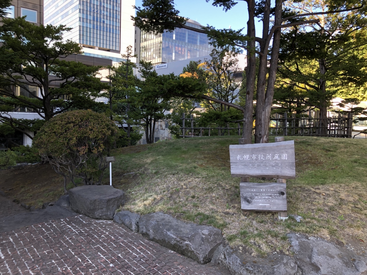 札幌市役所の大通公園側に面したところに「札幌市役所庭園」の入口がありました。入口には「ご自由に散策ください」と案内があり、いつでも自由に散策できるようです。入口から階段を下りると、大きな池もある庭園が広がっていました。人通りの多い通り沿いにありながら、ほとんど人はいなくてゆっくりと散策できました。札幌中心部にある穴場スポットだと思います。