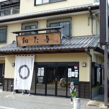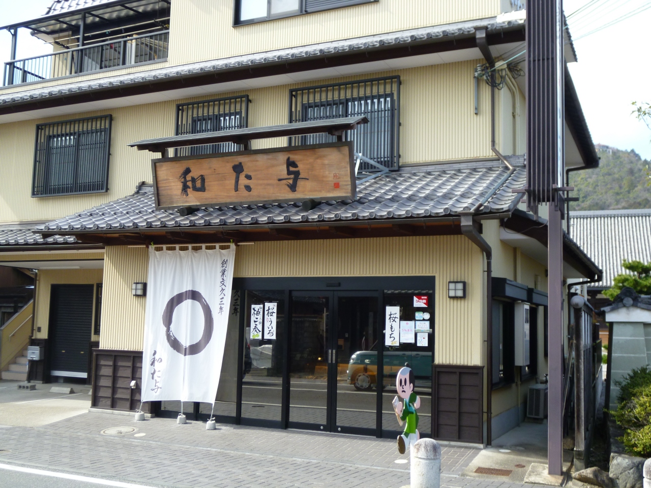 和た与は、JR近江八幡駅から北西の方向へ約2km離れた場所にあります。和た与は、文久3年の創業以来、150年以上続く老舗銘菓店です。自慢の近江銘菓「でっち羊羹」は、長年職人技を受け継ぎながらひとつひとつ手作りされています。でっち羊羹は、米粉は使ってないけど、もっちりとしていて素朴な味わいの羊羹です。でっち羊羹は、商家に奉公していた丁稚さん達が帰郷の際に家族へのお土産にしたことから、その名がついたといわれています。ういろう餅も人気で、米粉を使ったモチモチの生菓子で、黒糖風味とニッキの風味で美味しかったです。