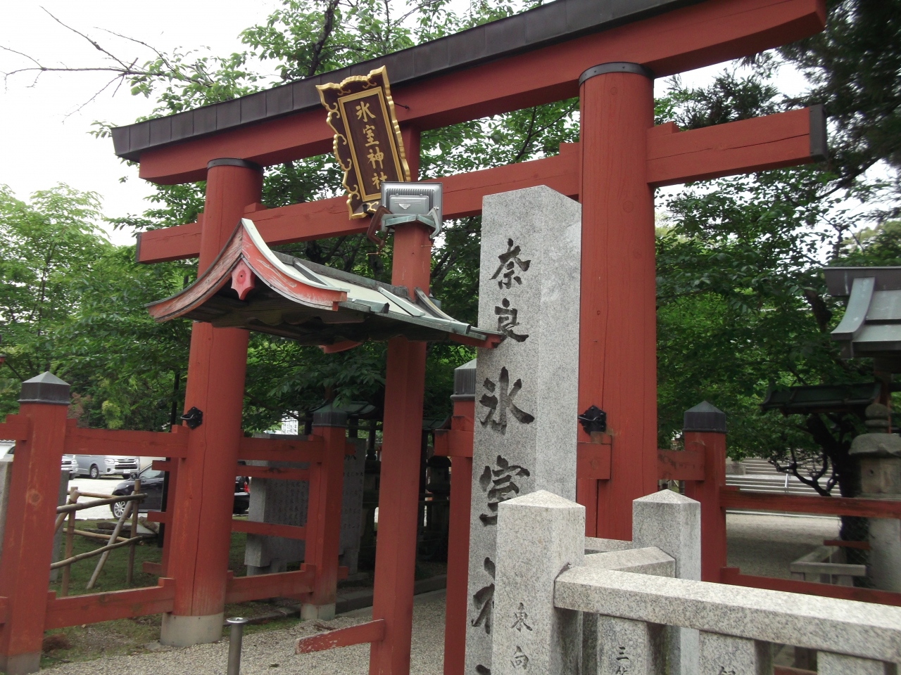 奈良国立博物館の大通りを隔てた向かいあたりにある神社です。大通り沿いに立つ朱色の鳥居がとても目立っていて、そこから拝殿までまっすぐに参道が続いています。奈良時代には、冬に凍らせた氷を氷室に保存し平城京へ献納されていました。現在では製氷関係の方の参拝が多いようです。