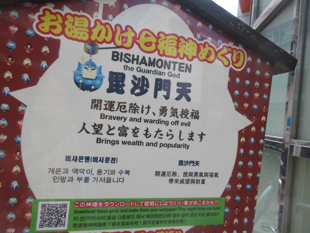 伊東温泉の駅前商店街にある「お湯かけ七福神」の一人、毘沙門天です。商店街の角地に建っていて、季節柄か「もみじと栗」の造花を持っていますので、秋を感じさせてくれました。「ぎざぎざのおひげ」の、にっこりながら強そうな神様です。人望と富をもたらし、開運に効く神様です。