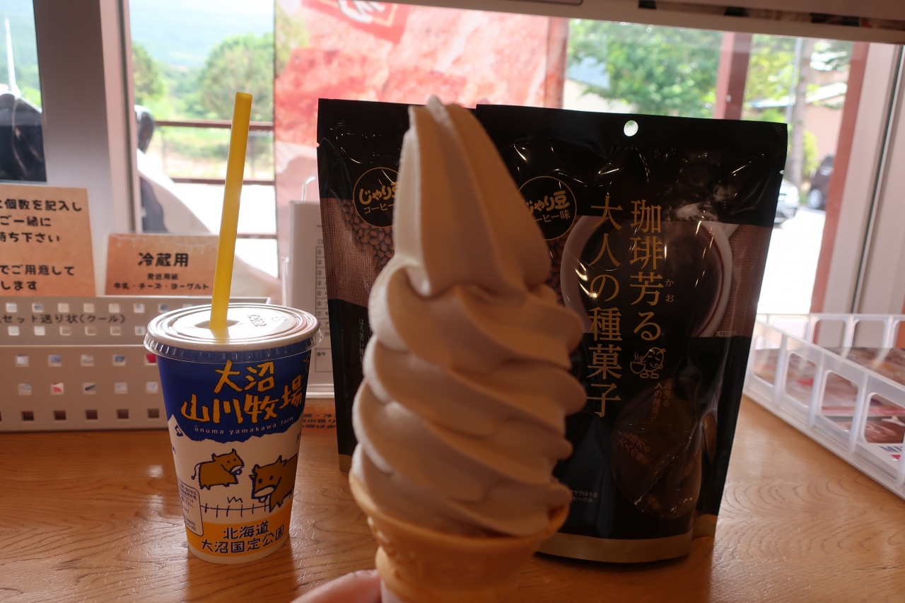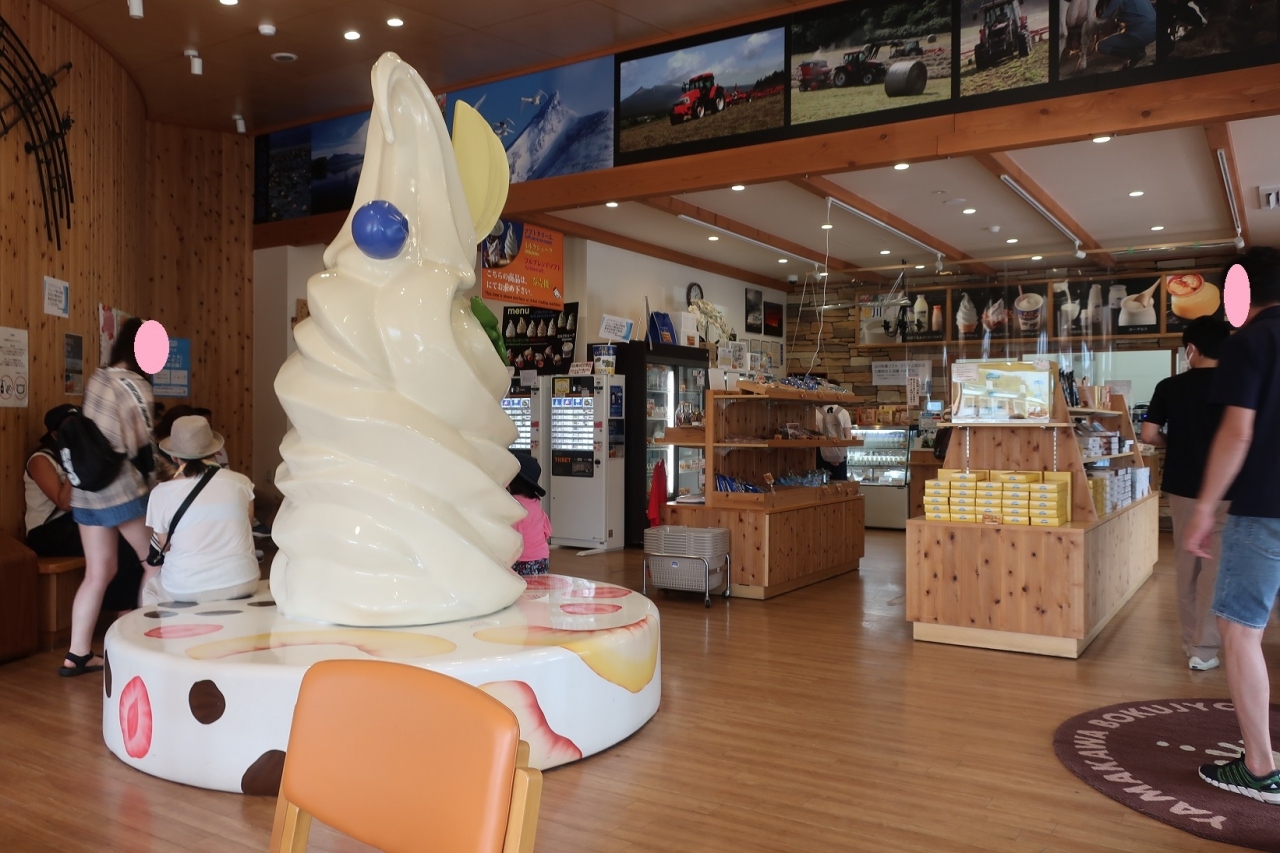 函館を訪れた際、大沼公園までドライブしました。その時に山川牧場ミルクプラントを見つけました。お店の中へ入ると大きなソフトクリームのオブジェが♪。店内は結構人が多く、人気のお店なんだと感じました。コーヒーミックスソフトクリームと夕張メロンシェークを注文。コーヒーミックスはそれほどミルクっぽさはなく、さっぱりと食べられました。おすすめです♪。夕張メロンシェークはメロンの風味しっかりで、おいしかったです。店内にはイートインコーナー、売店があります。駐車場も広く利用しやすいです。