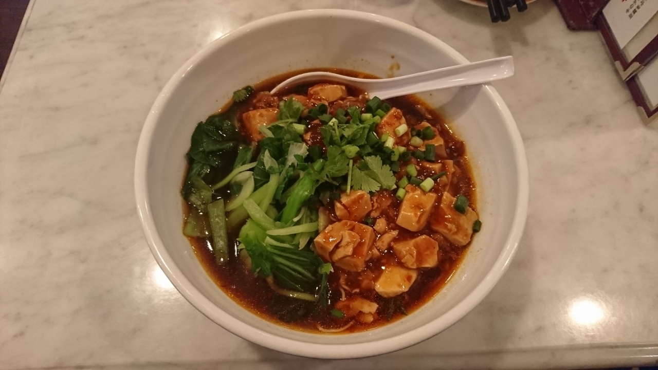 汐留の商業施設・汐留シティセンターの地下1階レストラン街にある台湾料理レストランです。夕食で麻辣湯麵をいただきました。極細縮れ中華麺の上に麻婆豆腐と青梗菜?がのっていて、スープは焦げ茶色の牛骨出汁スープ。辛さは控えめでしたが、独特な味のスープは美味しく、台湾風の麻婆麵を楽しみました。