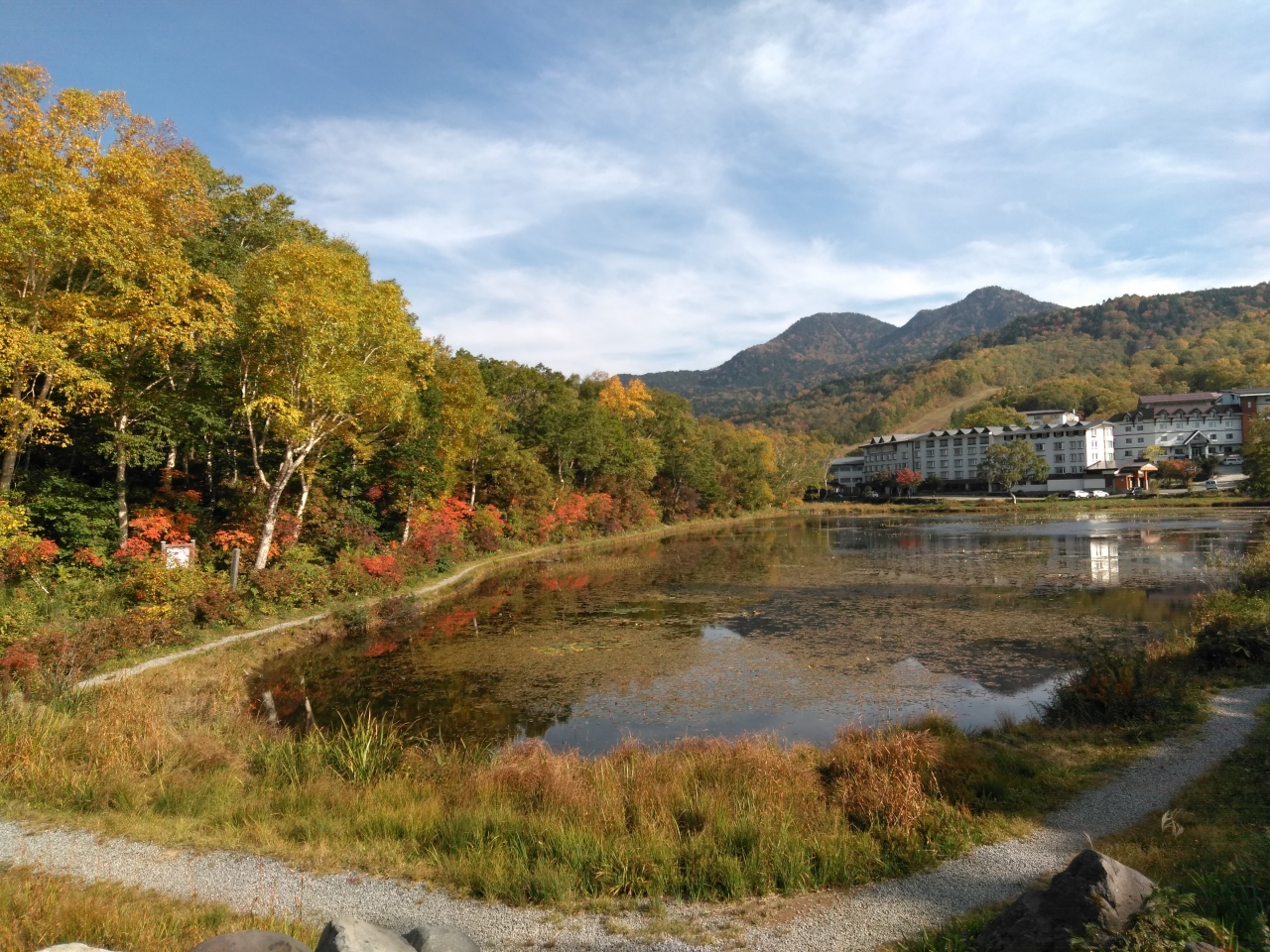 横手山の満天ビューテラスへ行った帰り、紅葉が綺麗だったので寄ってみました。すぐ横に「山の駅」の広い無料の駐車場があります。池の回りには遊歩道があって、散策も出来ます。紅葉が水面に映って綺麗でした。「山の駅」がお休みで残念でした。