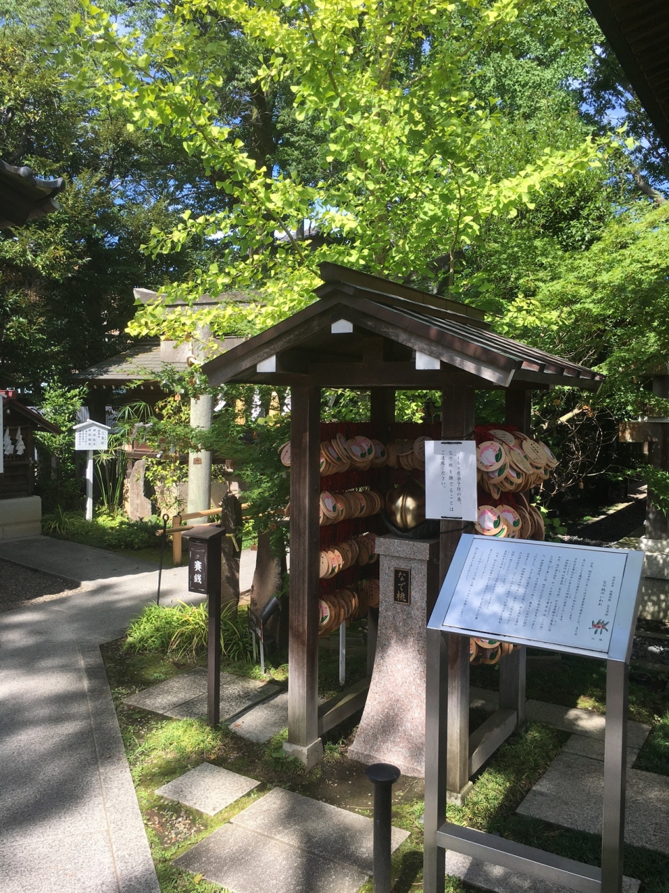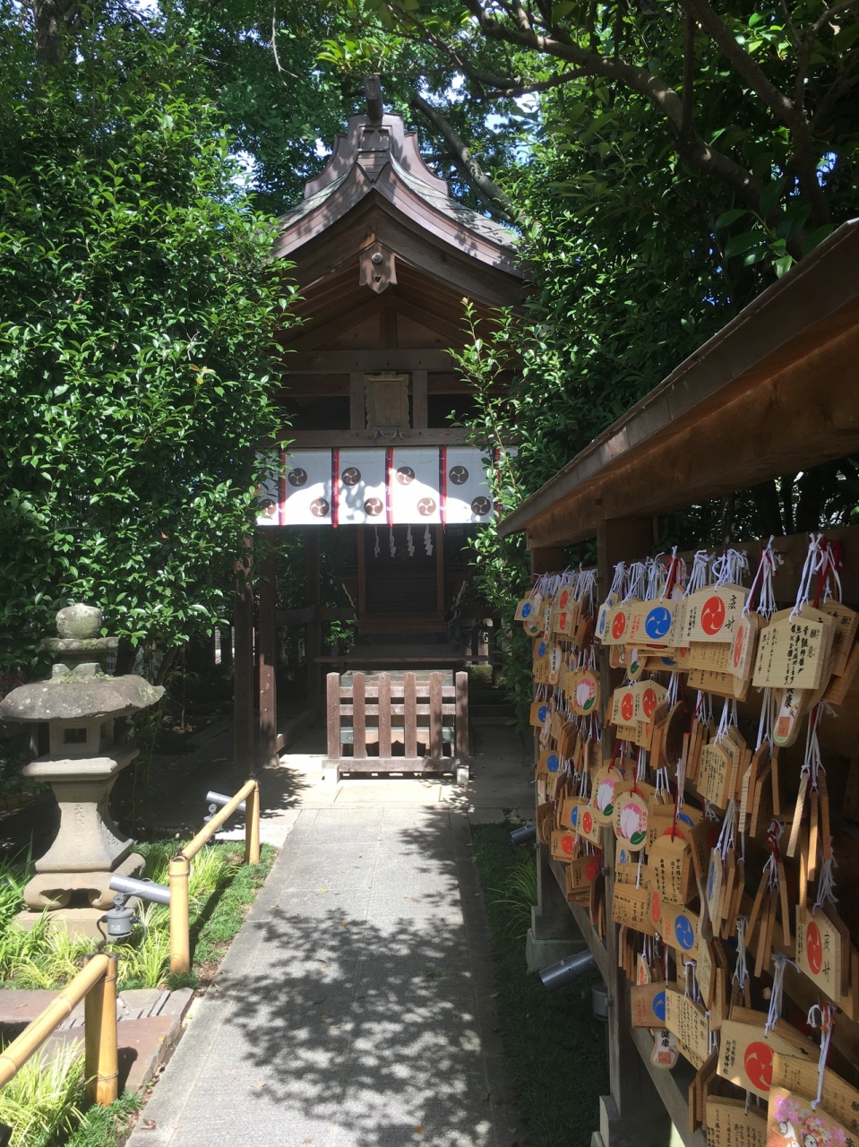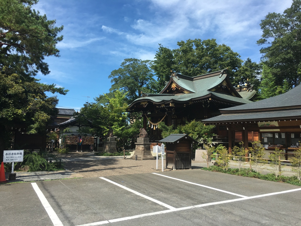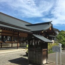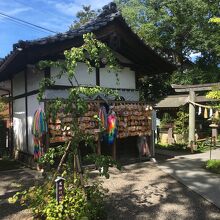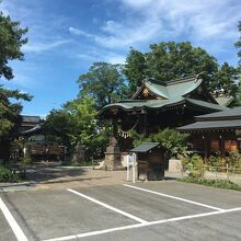 駐車場が社務所の前にあり、お守り等がたくさんありました。敷居がないので出入りしやすい境内で、末社のような小さな神社がいくつかあり、木々に囲まれて、多くの絵馬や千羽鶴が奉納されていました。社殿が格式ある建物でした。