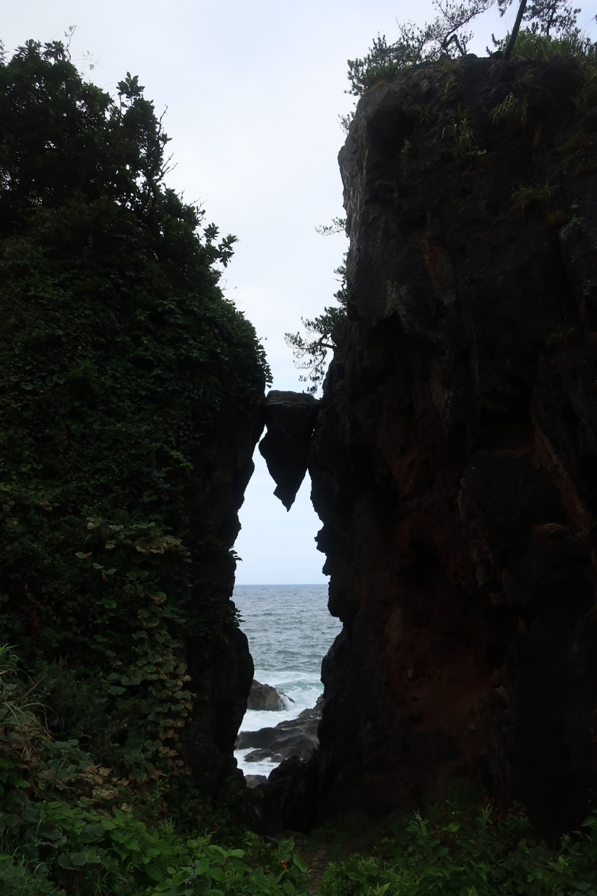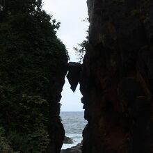 海岸に切り立つ2つの岩の隙間に楔のようにいわが挟まっています。