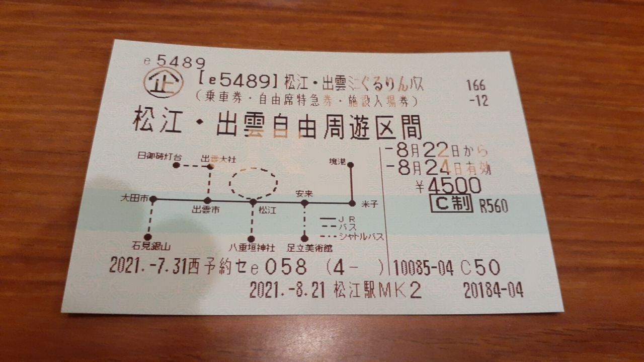 この切符、島根県の松江・出雲辺りを観光する方向けに発売されている切符で、2022年3月末までの好みの連続する3日間4,500円で山陰本線のうち米子~大田市間・境線の全区間の特急・快速・普通列車が利用し放題となるだけでなく、一部(基本的には玉造温泉発着便)を除く松江市内を走る一畑バスの路線バス・松江市交通局の路線バス・出雲市駅~出雲大社前~日御碕間の一畑バスの路線バス・大田市~石見銀山間の石見交通の路線バスも同じ期間であれば連続する3日間利用し放題となり、さらに松江城・足立美術館・武家屋敷・小泉八雲記念館・水木しげる記念館等全部で9ヶ所の観光施設も連続する同じ期間であれば3日間何回でも入出場できます。