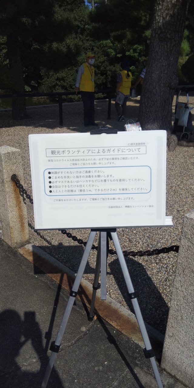仁徳天皇陵古墳は堺市堺区にある日本一大きな古墳として有名です。大阪府も緊急事態宣言やまん延防止などがあり、しばらくボランティアさんの姿をみかけませんでしたが、緊急事態宣言が解除され、いらっしゃっていました。この日は3人スタンバイされていました。場所は拝所のあたりです。