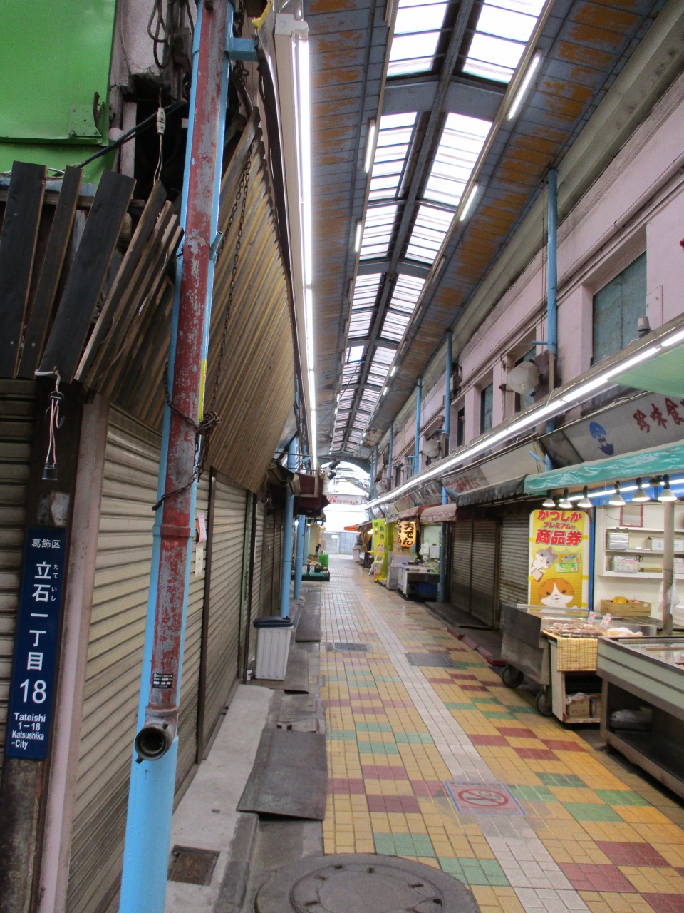 京成電鉄立石駅から降りてすぐ近くに、庶民の台所といった下町の商店街がありました。アーケード街になっているので、雨が降っても濡れずに買い物が出来て便利そうです。ただし、残念ながらて、昔は賑やかだったのだろうと、ちょっと寂しい気持ちにもなりました。