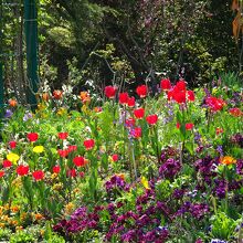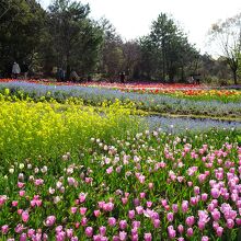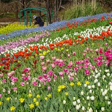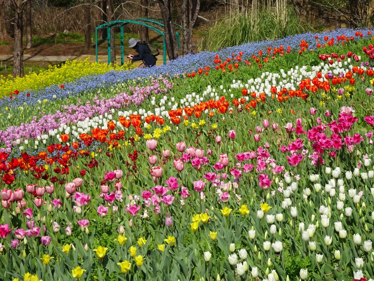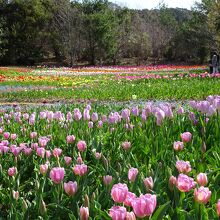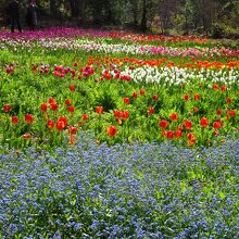 「水の庭」の奥にある丘で栽培している早咲きチューリップです。今年は約600平方メートルに、32種類約3万本のチューリップを植えモネの「サッセンハイムのチューリップ畑」を再現しているそうです。
