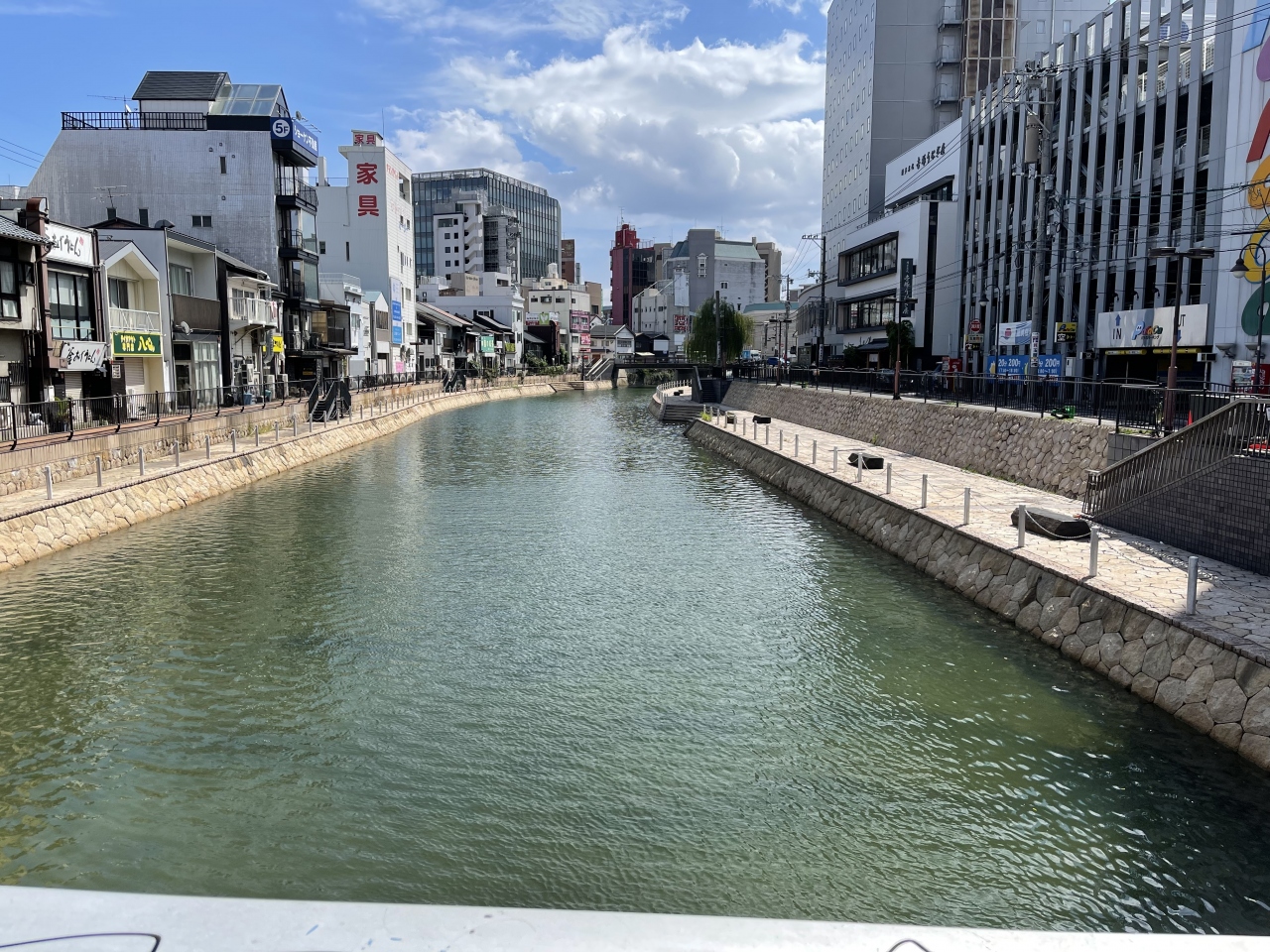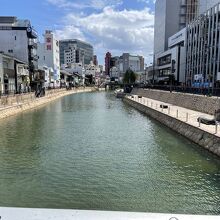 中洲と川端商店街をつなぐ短い橋です。那珂川にかかっていて、柳が揺れる景色は風情があると思いました。それはお昼ですが、夜はおそらくライトが川面に反射してきれいなのではないかと思います。川沿いに降りることができる階段もあります。