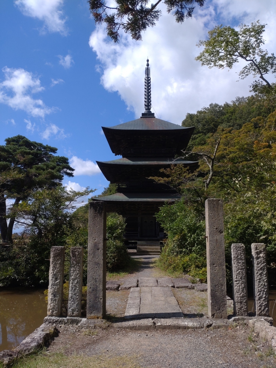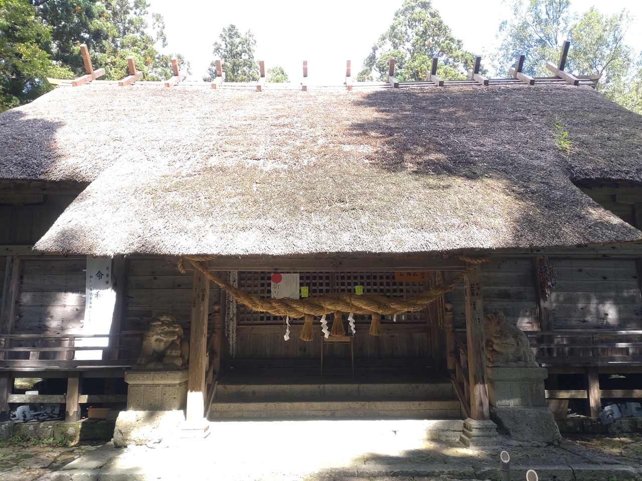 日本昔ばなしに描かれそうなのどかな風景です。水田や山に囲まれた三重塔。木立の参道を歩いていくとその先に見えてくる茅葺きの本殿。古き良き時代の日本を感じさせてくれました。こういうところ、ありそうでないですよね。