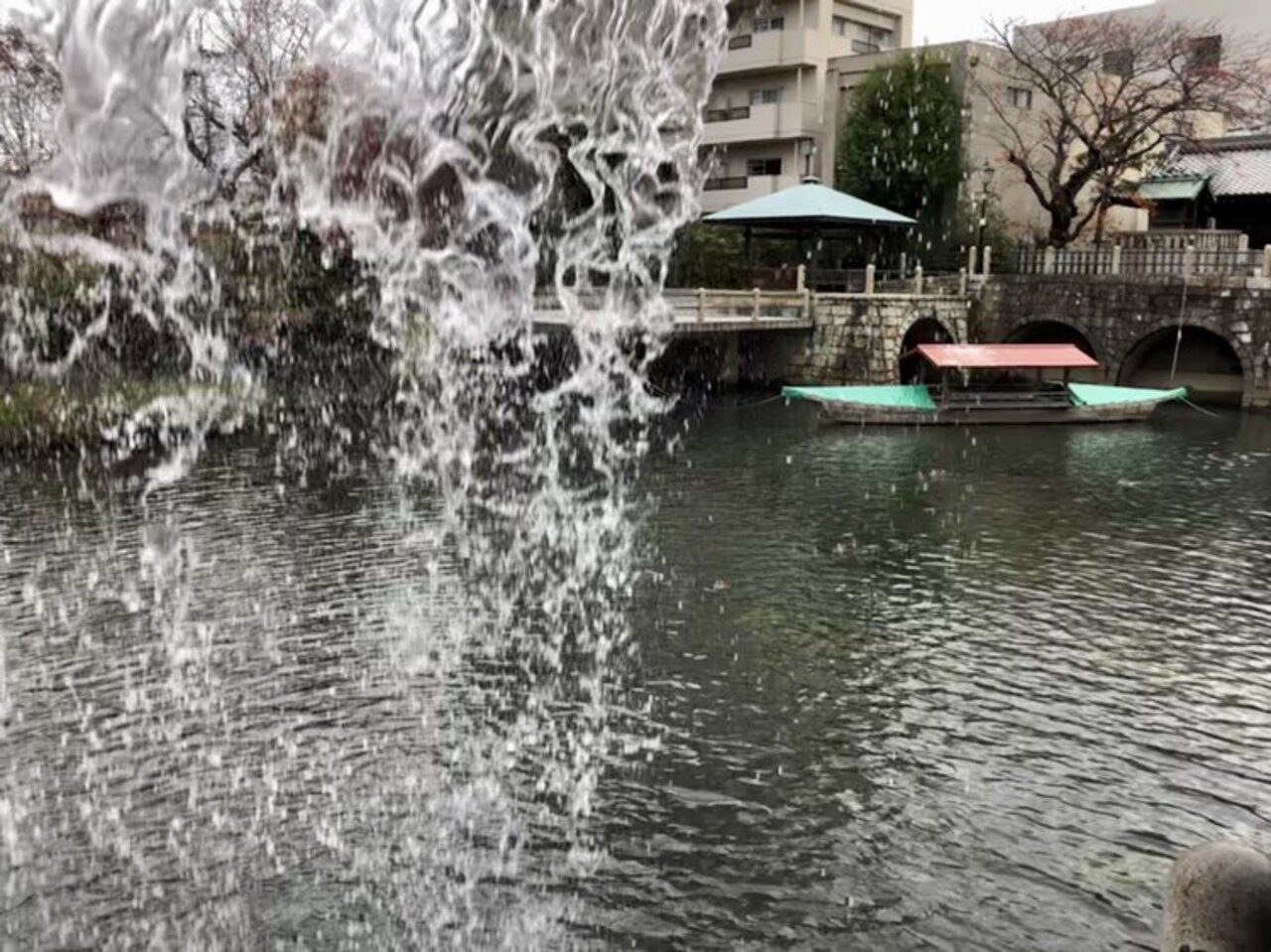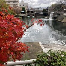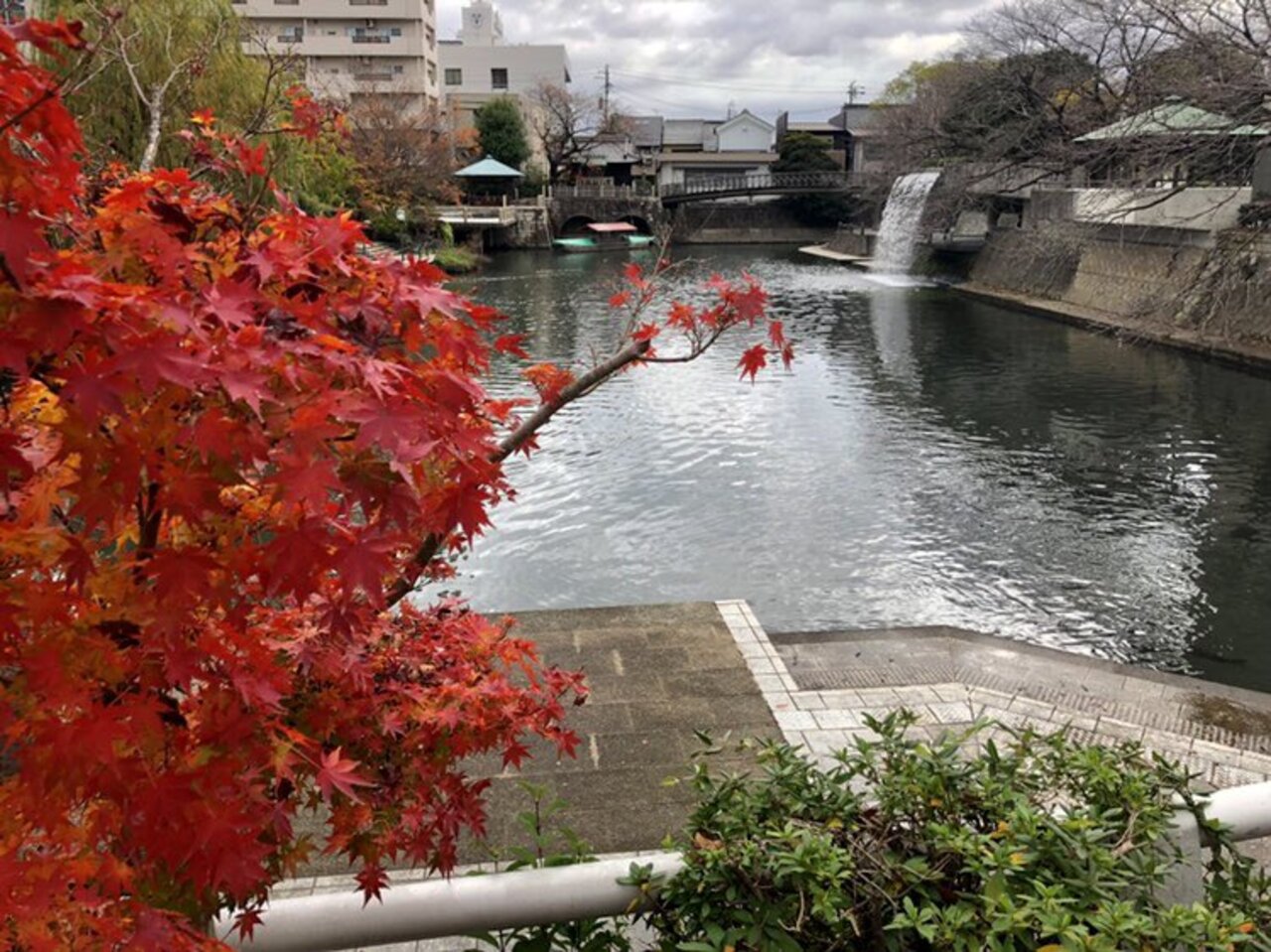 水門川遊歩道 四季の広場は、観光案内所からもらった観光マップに従い、川沿いの四季の道を歩きながらたどり着いた場所で、親水広場や水上ステージ、滝のトンネル、虹の橋などが設けられ、水を主役にした公園で、とても素敵な場所でした。水門川舟下りが楽しめる出発点でもあるそうです。