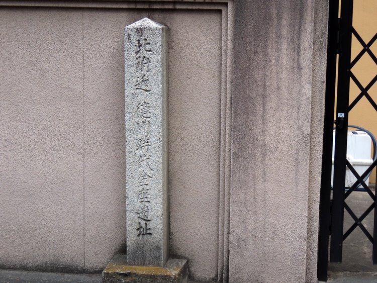 此付近江戸時代金座遣址…の石柱のみが残っています。そして銀座遺址もすぐ近くにあるんですね。現在京都国際マンガミュージアムになっている場所は以前小学校でその裏門にあたる位置でひっそり。さらに近くに室町末期の二条殿址の石柱もあります。徳川幕府の御殿跡地利用なのでしょうか。