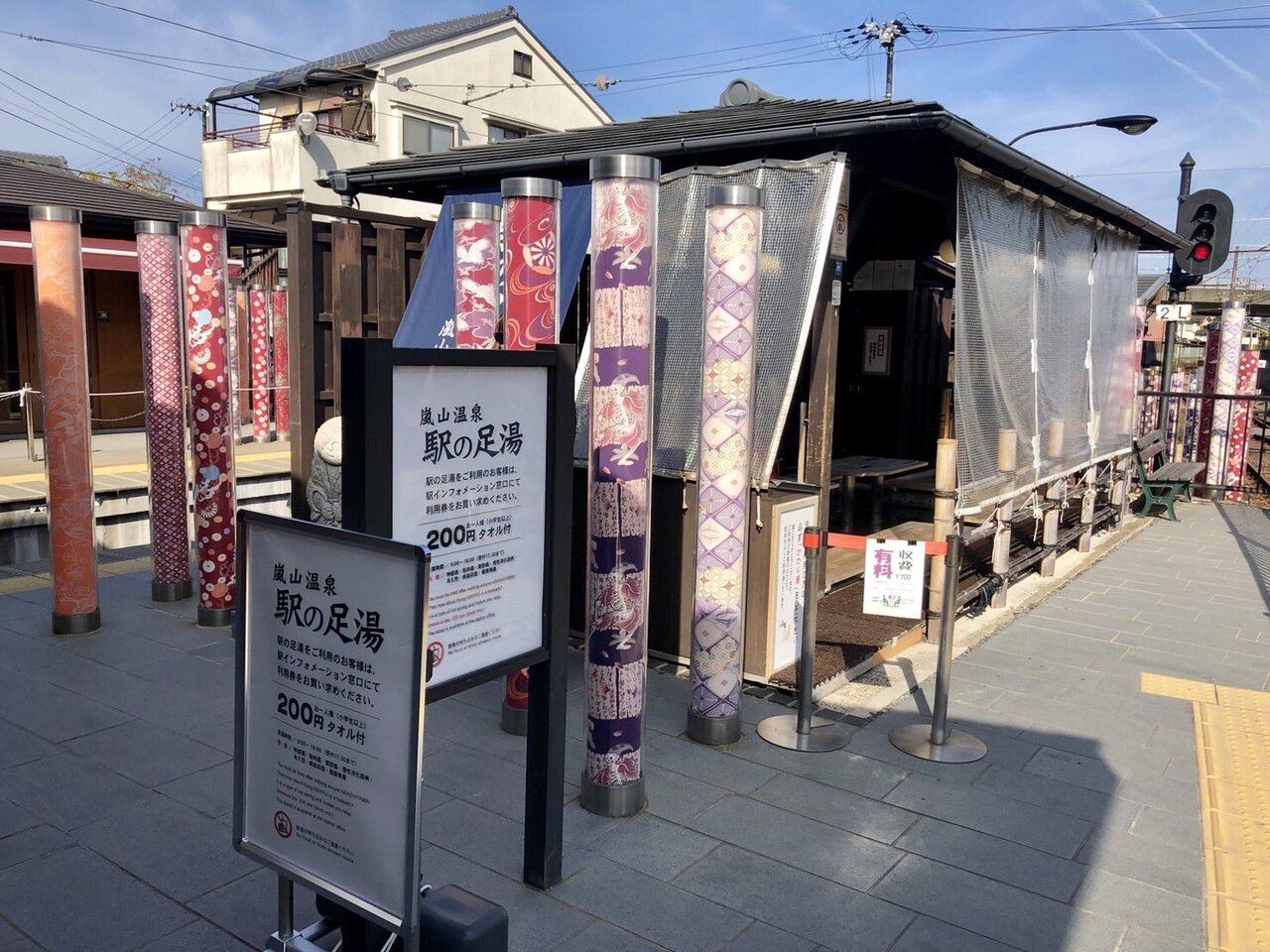 嵐山駅構内の最奥に「嵐山温泉 えきの足湯」がありました。駅構内には入場券を買わずに、自由に出入りできますが、足湯に入るには、駅のインフォメーションで、入湯料200円を支払い、タオルをもらって、それを証に入ります。