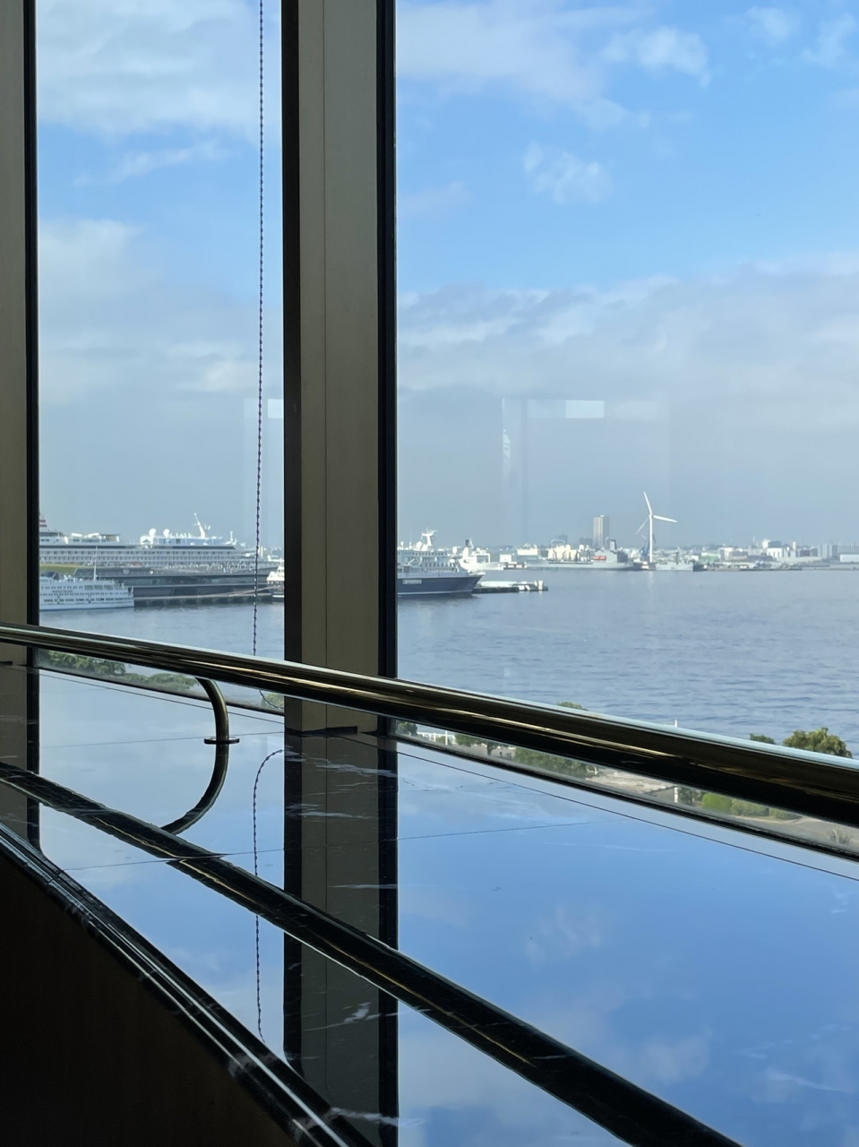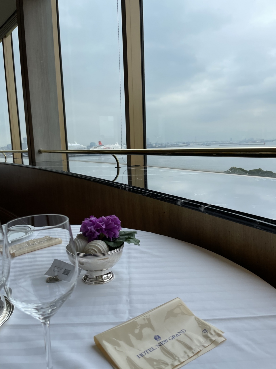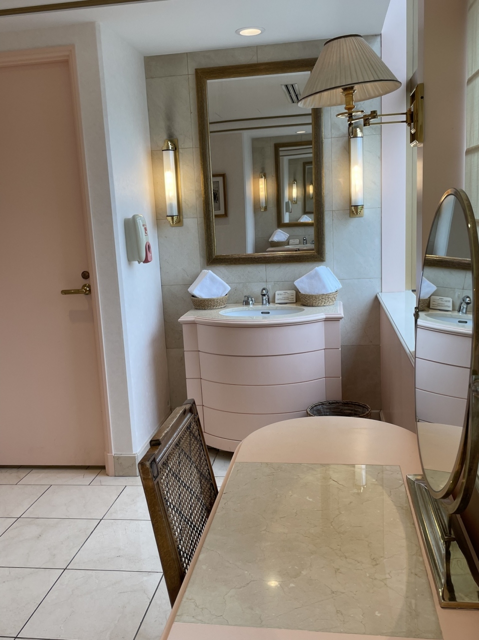 ホテルニューグランドのレストランです。山下公園や氷川丸、飛鳥などがよく見えます。レストランは広く、ソーシャルディスタンスは、ばっちり。窓の外の景色を眺めながら、ゆったりお食事をいただくことができます。ランチコースをいただきましたが、お料理ももちろんおいしいです。女子トイレも、ピンクが基調でとてもかわいいです。