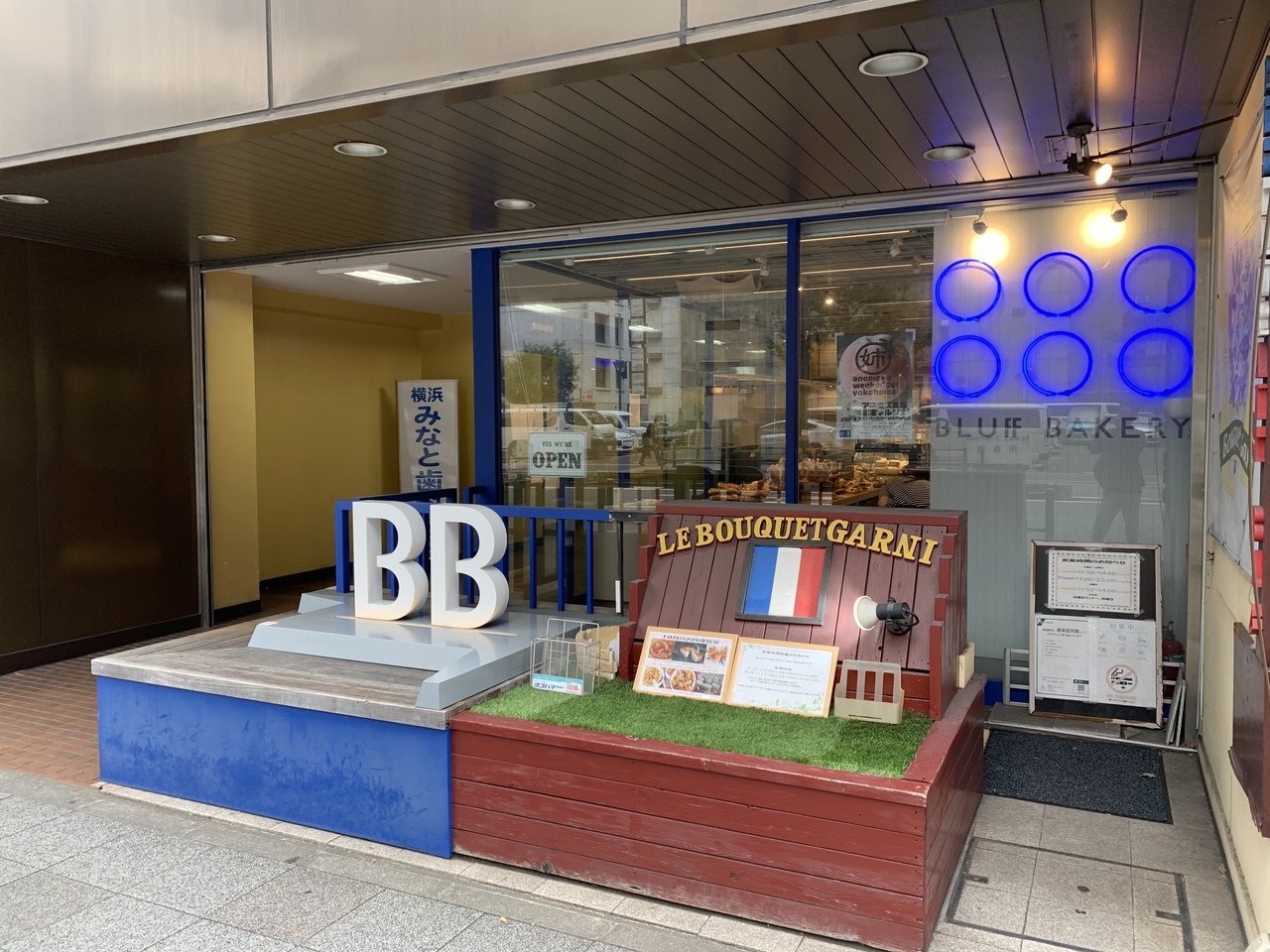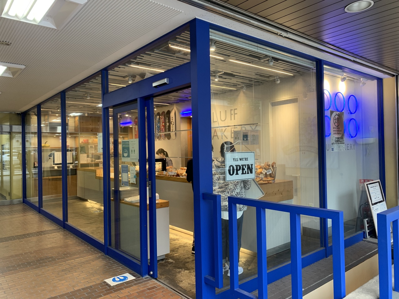 ガラス張りで、マリンブルーの柱がアクセントになっています。