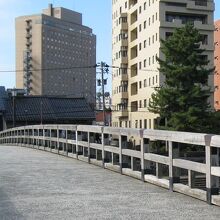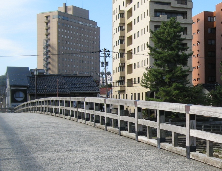 ひがし茶屋街近くの浅野川にかかる歩行者専用の橋です。橋桁はコンクリート造りの様ですが、木製の欄干が設けられていて一見木製の橋に見え、僅かにカーブを描く造りはそれなりの風情はあります。梅ノ橋から下流にかけて河岸には遊歩道が設けられていて金沢らしい風景を望みながら散策するのに良いと思います。