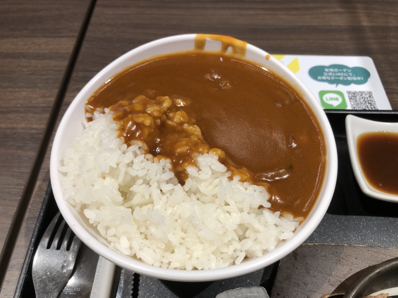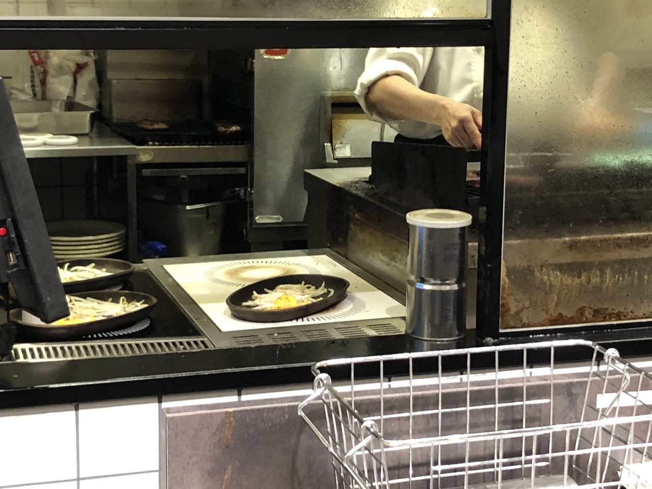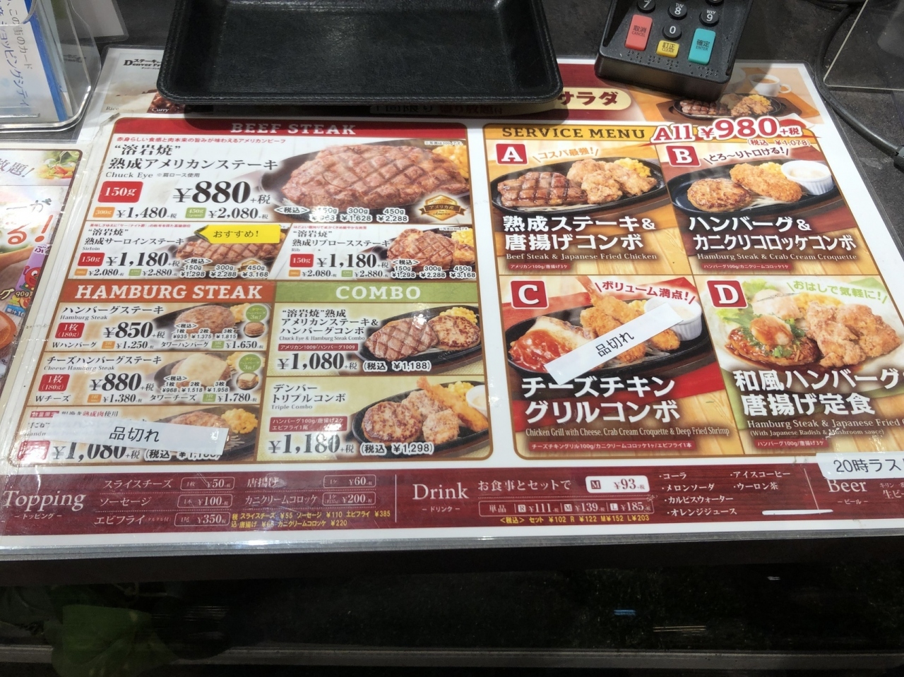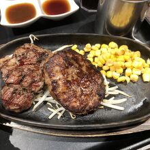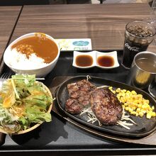 今回は、ステーキとハンバーグ両方が楽しめる「溶岩焼熟成アメリカンステーキ&ハンバーグコンボ」を注文。まず牛肉は少し固めではあるが、しっかりとした赤身肉で、価格を考えるとかなり良い線をいっている。ハンバーグは逆にかなり柔らかい。残念なのは、せっかく鉄板を使っているものの、ガスが使えない(フードコートなので)ためか、すぐに冷めてしまうことと。もう一つ、3種類のうちから2つ選ぶソースにもう少しこだわりがあるとよいかと。カレーはお肉屋さんのカレーで満足感あり、サラダはドレッシングが美味でした。総合的にはお財布に優しいステーキ店だと思う。