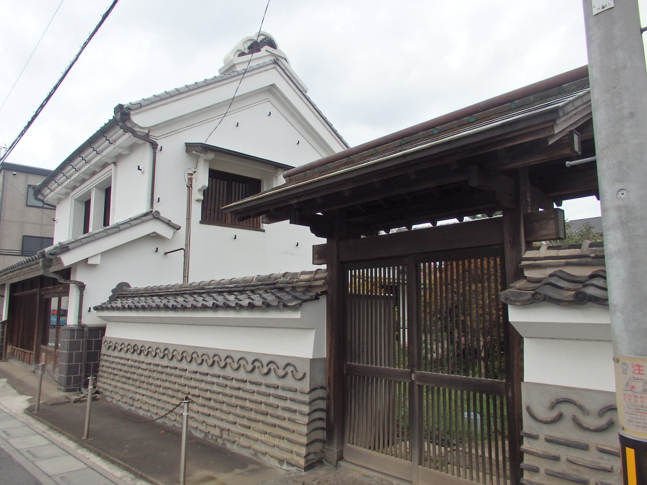 白木綿問屋を営んでいた長谷川家の店蔵と母屋は明治初期の建物で、国登録有形文化財です。個人宅であるので、内部は見学できません。白木木綿を連想させるためか、鮮やかな白い漆喰塗が引き立ちます。また店蔵の屋根に置かれている鬼瓦も大きくて立派です