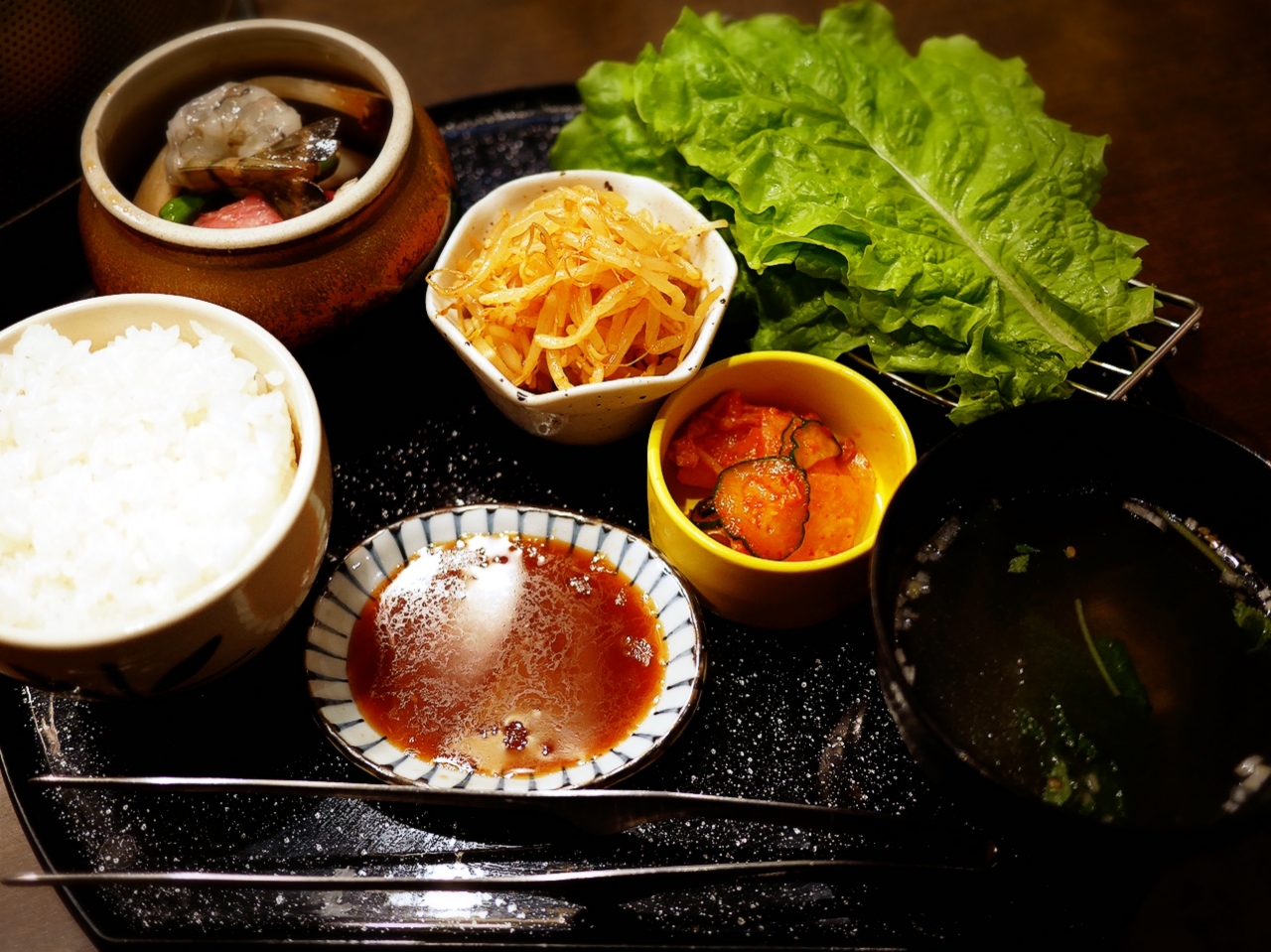キムチは、あまり美味しくありませんし、辛もやしは少し辛さが足りないかな。わかめスープとライスの質は、平均的です。ライス、サンチュ、辛もやしがおかわり出来るので、お腹一杯になります。