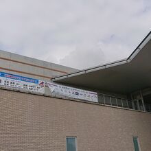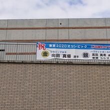 体育館に、刈谷市ゆかりの東京五輪メダリストを称える幕が掲示されていました