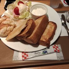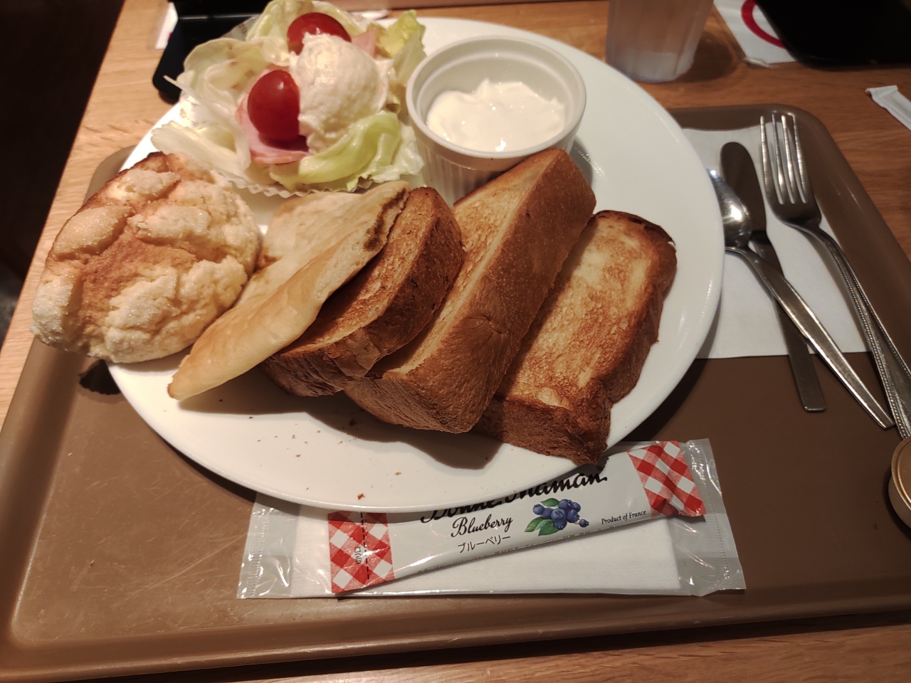 天神駅すぐのパルコ内にあります。モーニングは好きなドリンクにパン、ヨーグルト、ハムサラダ、ポテトサラダで、500円ほどでした。パンは5種類から5枚まで選べました。焼き立てで提供され、美味しかったです。会計は先払いで、クレジットカードなどが使えます。