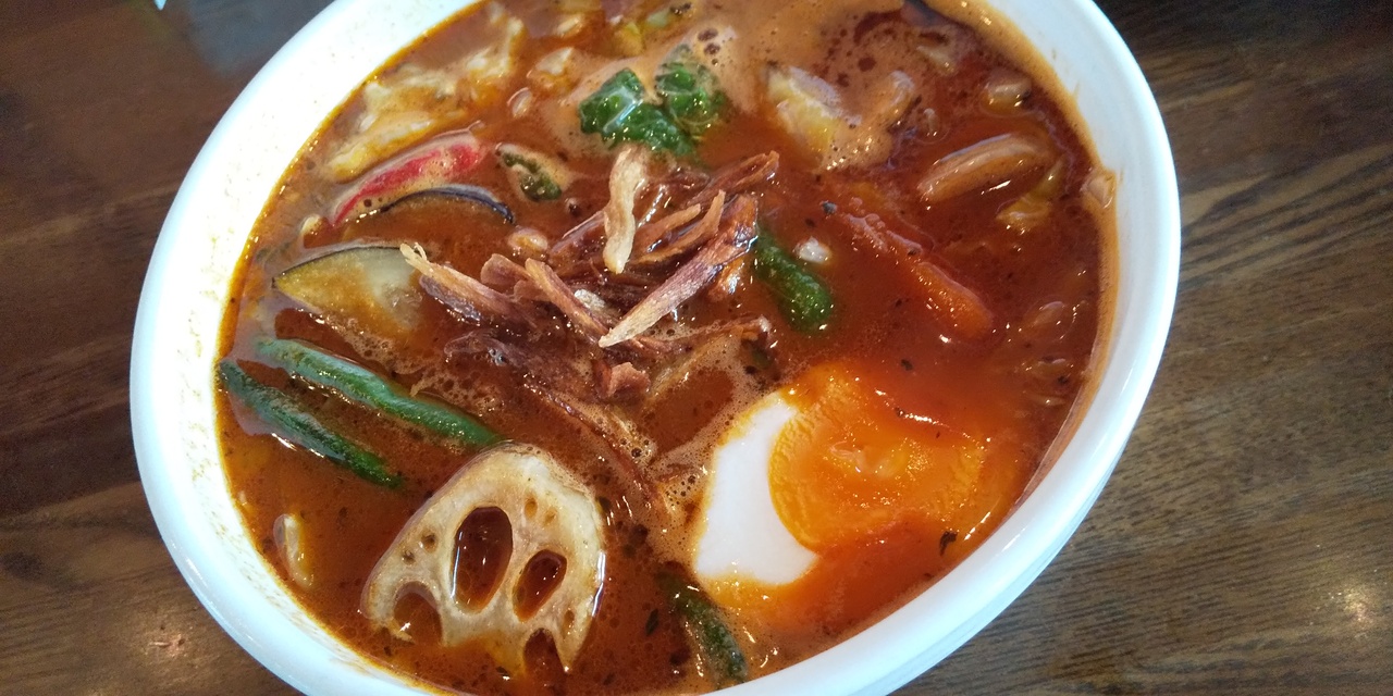 江別市にあるスープカレーチェーン店の江別店。若いスタッフが頑張っています。スパイシーなカレーで辛さは好みでえべます。玄米と白米、トッピングもお好みでチョイス。江別店オリジナルメニューもあり、豚の角煮は柔らかい角煮をライスに乗っけてスープカレー、なかなかユニーク