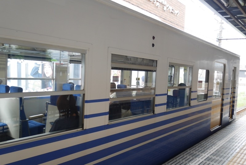 田原町から福井へともどるときに利用しました。駅名表示が雲っぽいフワフワなフキダシでかわいい〜!全国的にみてもなかなかこういうユニークな表示は少ないのではないでしょうか。電車のカラーは青と黄色が基調で、これまた明るい気持ちになれる色でいいなと思いました。