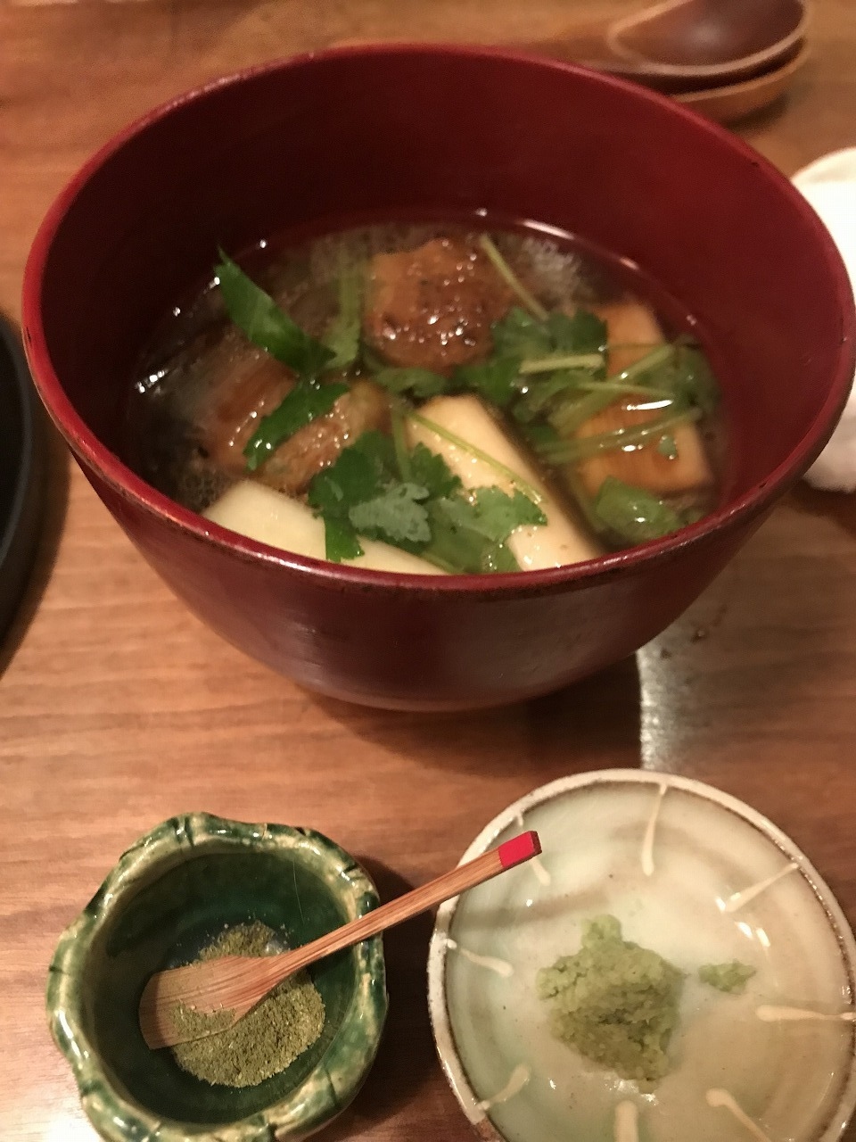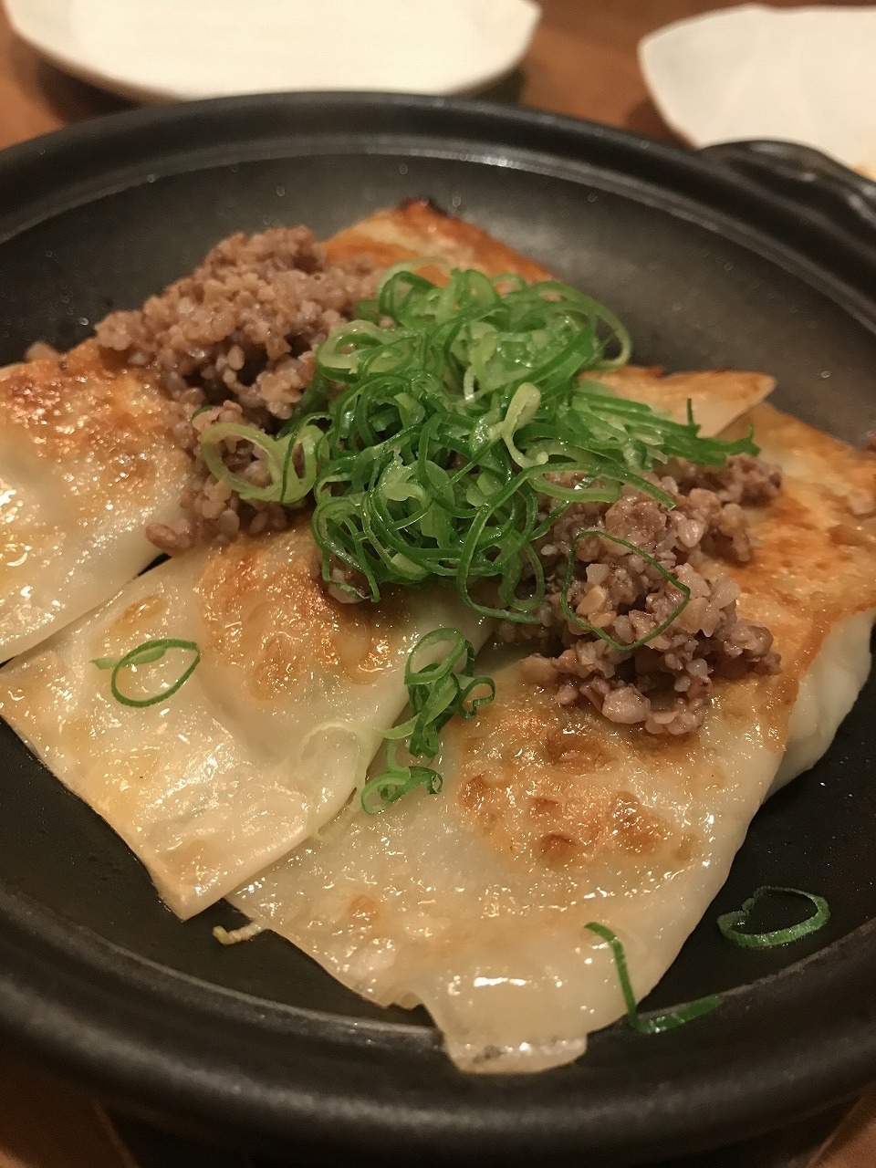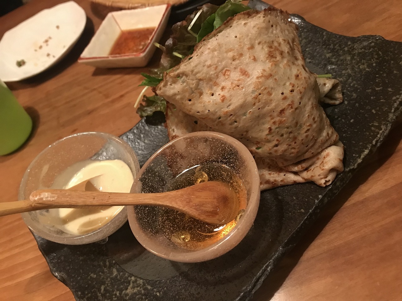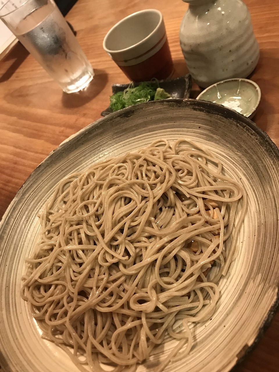 京都の五条通りにある蕎麦です。店構えも立派で、土日夜には行列ができます。とろろそば、鴨汁つけそば、十割そば、そば粉のガレット、そば餃子を注か文。そばは、太切り、並み切り、細切りから選べます。太切りは結構太いです。そば餃子は皮にそば粉が練り込んであり、蕎麦の実が散らしてあります。味は普通に餃子かな。そば粉のガレットはボリュームたっぷりで、わさびマヨとチリソースで食べます。蕎麦湯も湯がいた汁ではなく、そば粉から作ったもので、少しとろみがあって美味しいです。
