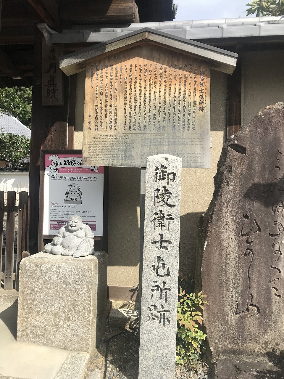 東山区の高台寺月真院にある、幕末に新撰組から分かれて孝明天皇の御陵衛士となった伊東甲子太郎ら15名が屯所とした所です。今は石碑と看板しかありませんが、幕末の歴史好き、新撰組好きには感慨深いスポットだと思います。