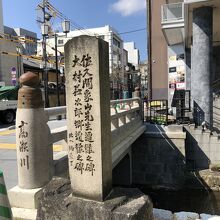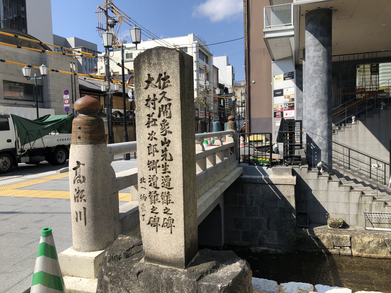 高瀬川に架かる三条小橋の橋の袂に「遭難の碑」が立っています。そこから高瀬川沿いを北上し木屋町通りの御池から上がるとすぐのところ、一之船入の付近には立派な石碑が二つ並んで立っています。残念ながら高瀬川の向こう側なので近づいて観ることはできません。木屋町通りは幕末に関する史跡などがたくさんあるので散策するには面白いですよ。