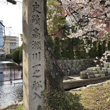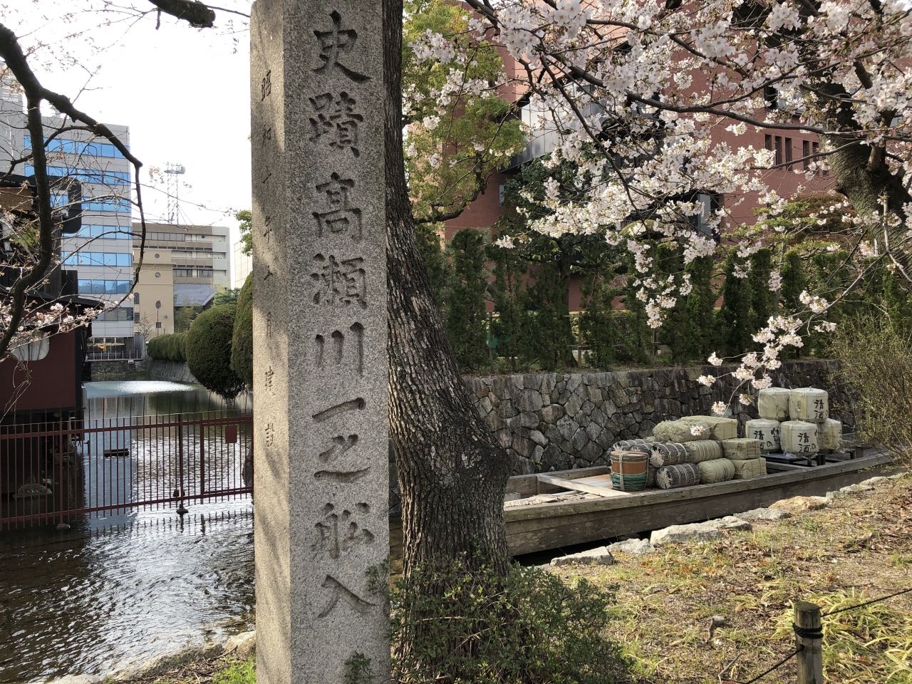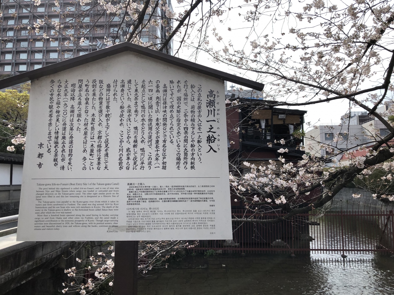 高瀬川は、角倉了以が物資輸送のために鴨川の水を引いて開いた運河です。この川で用いる舟を高瀬舟といい二条から五条にかけて7つの船入り(荷物の積みおろしをするための船だまり)があり、そのうち二条の一之船入跡は国の史跡として保存されています。満開の桜を見ながら高瀬川沿いを散策するのがお勧めです。