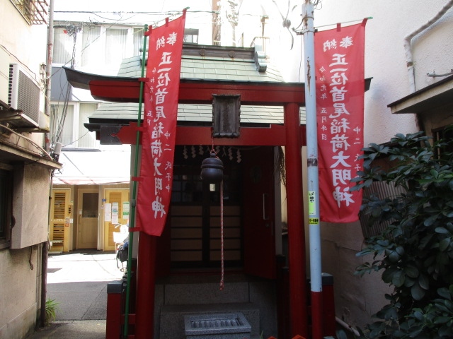 都営大江戸線大門駅から芝パークビル方面に進むと尾崎紅葉生誕の地説明板裏に首尾稲荷大明神社社殿はあります。首尾稲荷大明神は飲食店が軒を連ねる裏通りと裏通りを結ぶ小路沿いにある小さなお稲荷さんです。鳥居、鈴、社殿がコンパクトで氏子が奉納した幟がはためき清掃も行き届いていて庶民に愛されているお稲荷さんと感じました。病気の平癒に感謝して創建されたそうです。