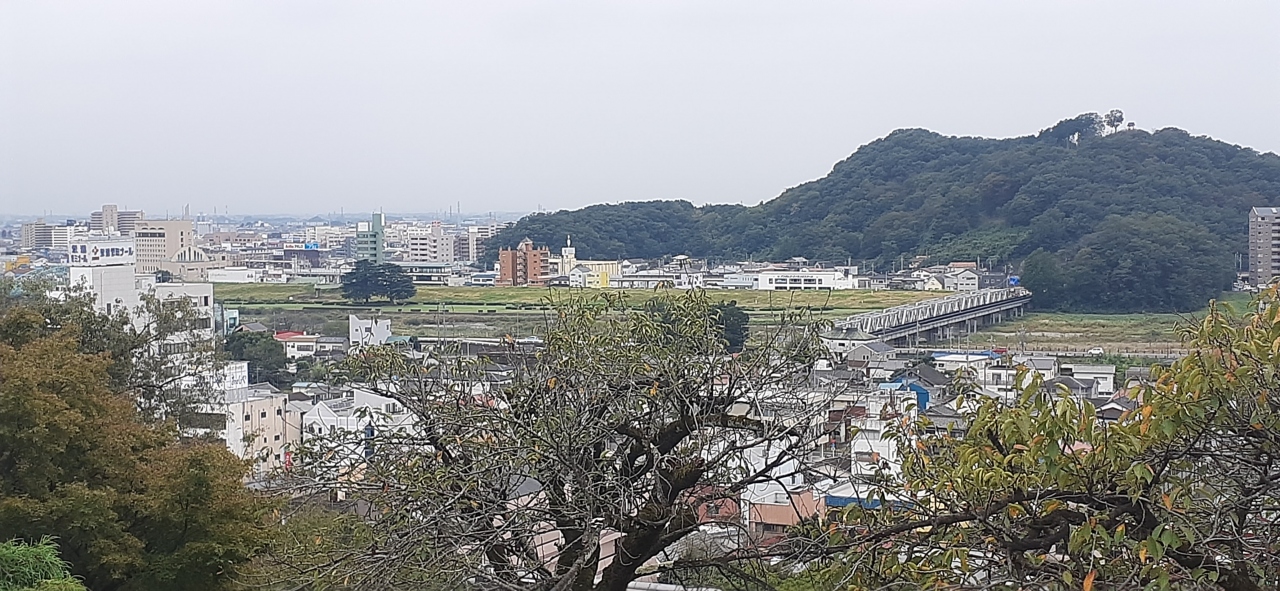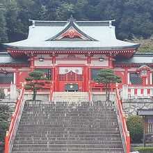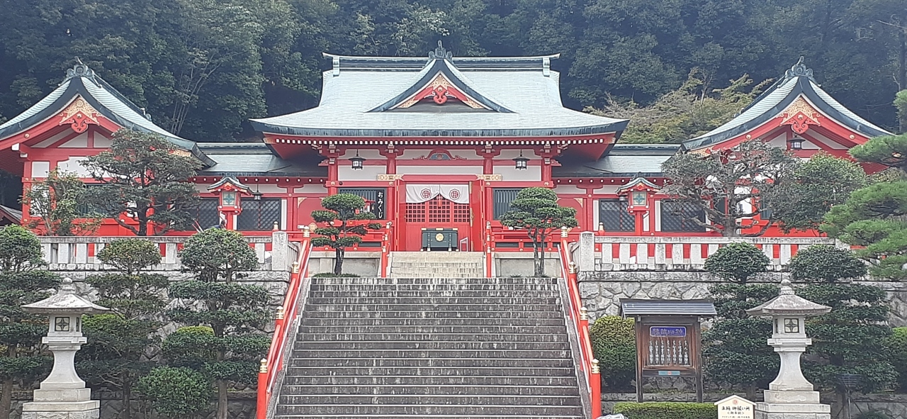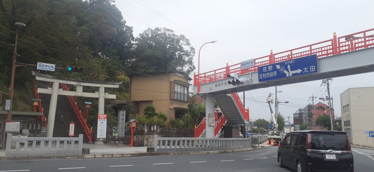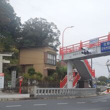 神社の「朱色」の歩道橋の前からひたすら階段を登って行きます。