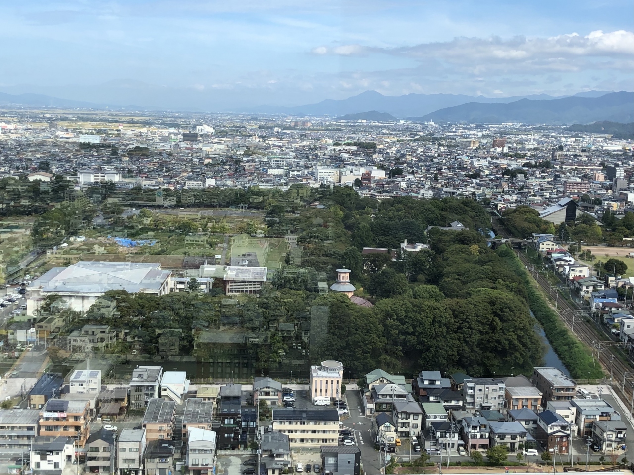 山形駅西口とペデストリアンデッキで繋がっています。中にはホテル、レストラン、学校、公共施設などが入っています。24階には展望室があり、無料で、市内を一望することができます。私たち以外には、高校生カップルが一組いただけでした。写真もあり、山の名前などが分かります。