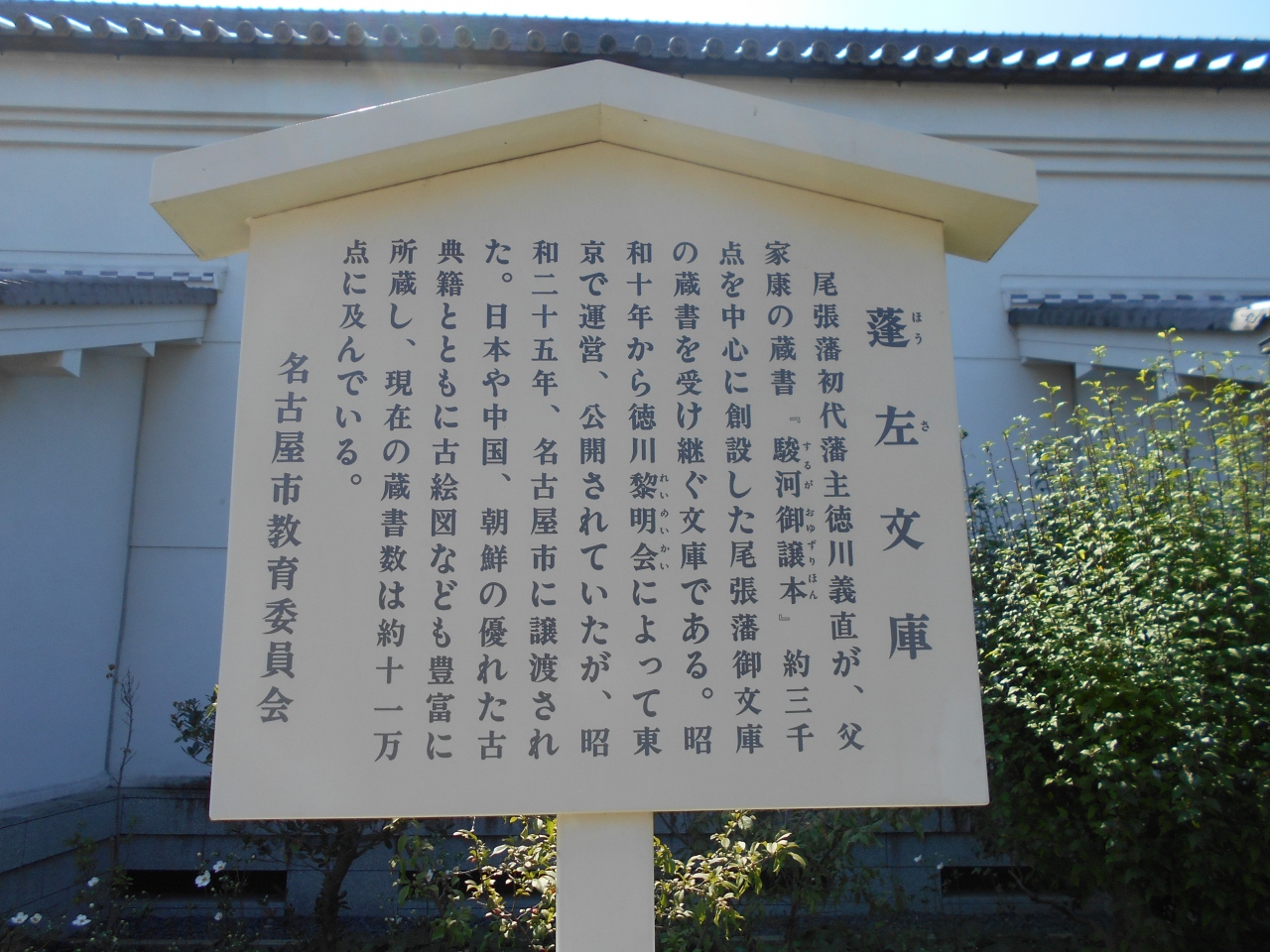 徳川御三家筆頭である尾張徳川家の旧蔵書を中心に和漢の優れた古典籍を所蔵する公開文庫。12万点の蔵書を所蔵し、他に尾張徳川家に伝えられた絵図も所蔵されています。「蓬左」とは江戸時代に使用された名古屋の別称だそうです。熱田神宮の蓬莱山の左方の町で「左方」、名古屋城は「蓬左城」と呼ばれたようです。