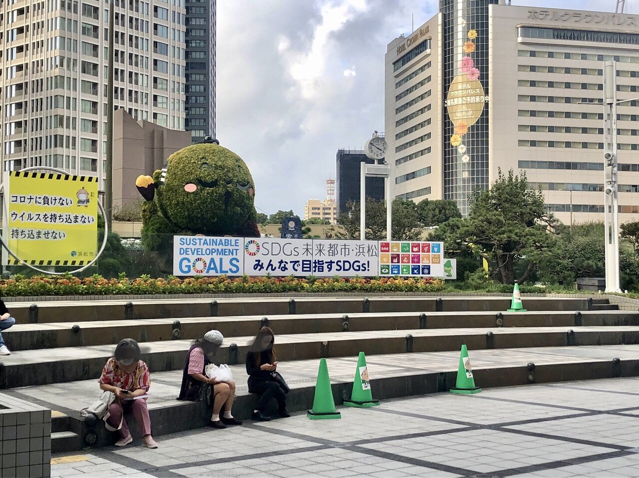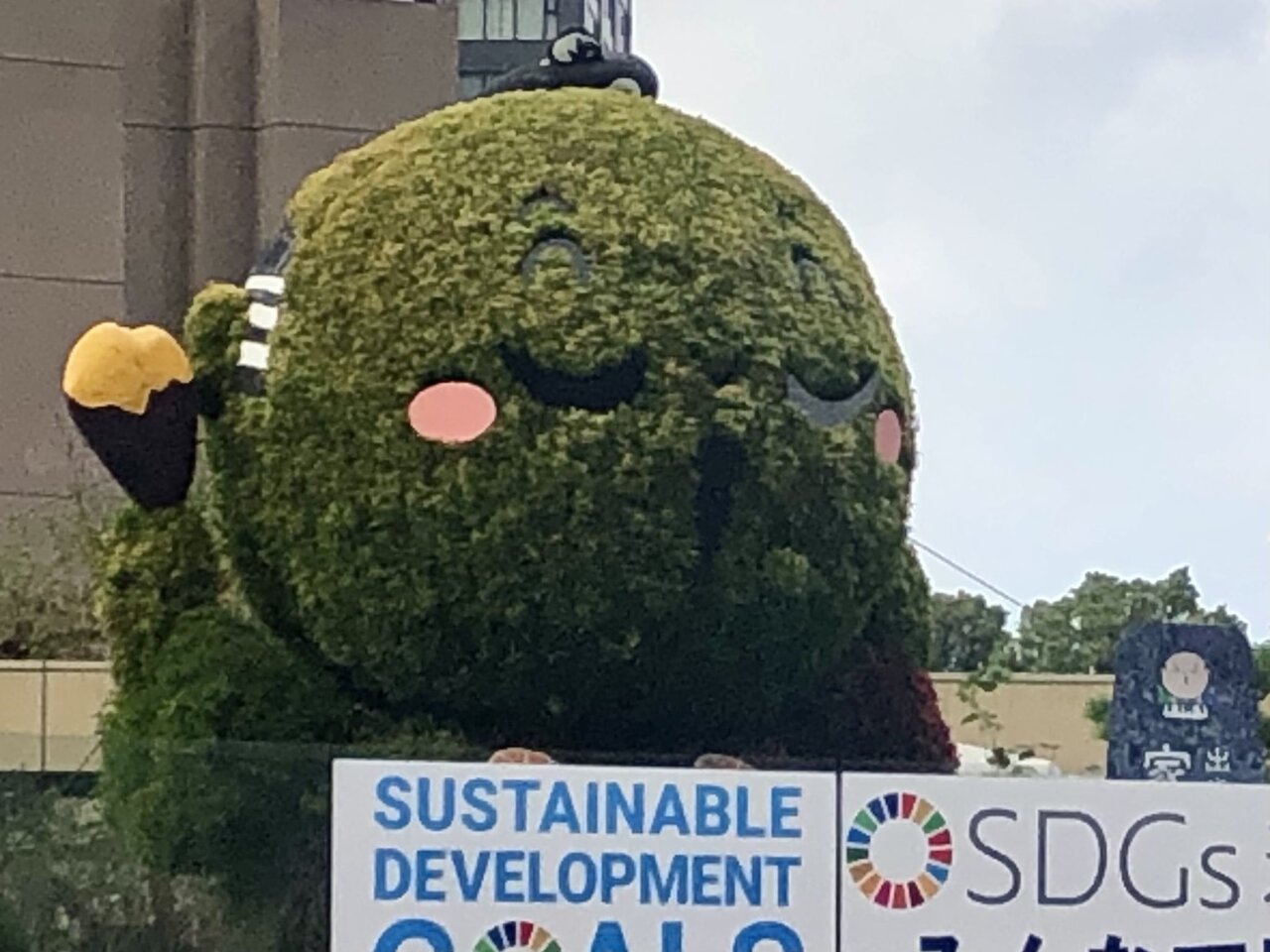 浜松駅北口を出ると、すぐ正面に、モザイカルチャー 出世大名家康くんがあります。浜松のゆるキャラである、出世大名家康くんをあしらった、盆栽のアートです。