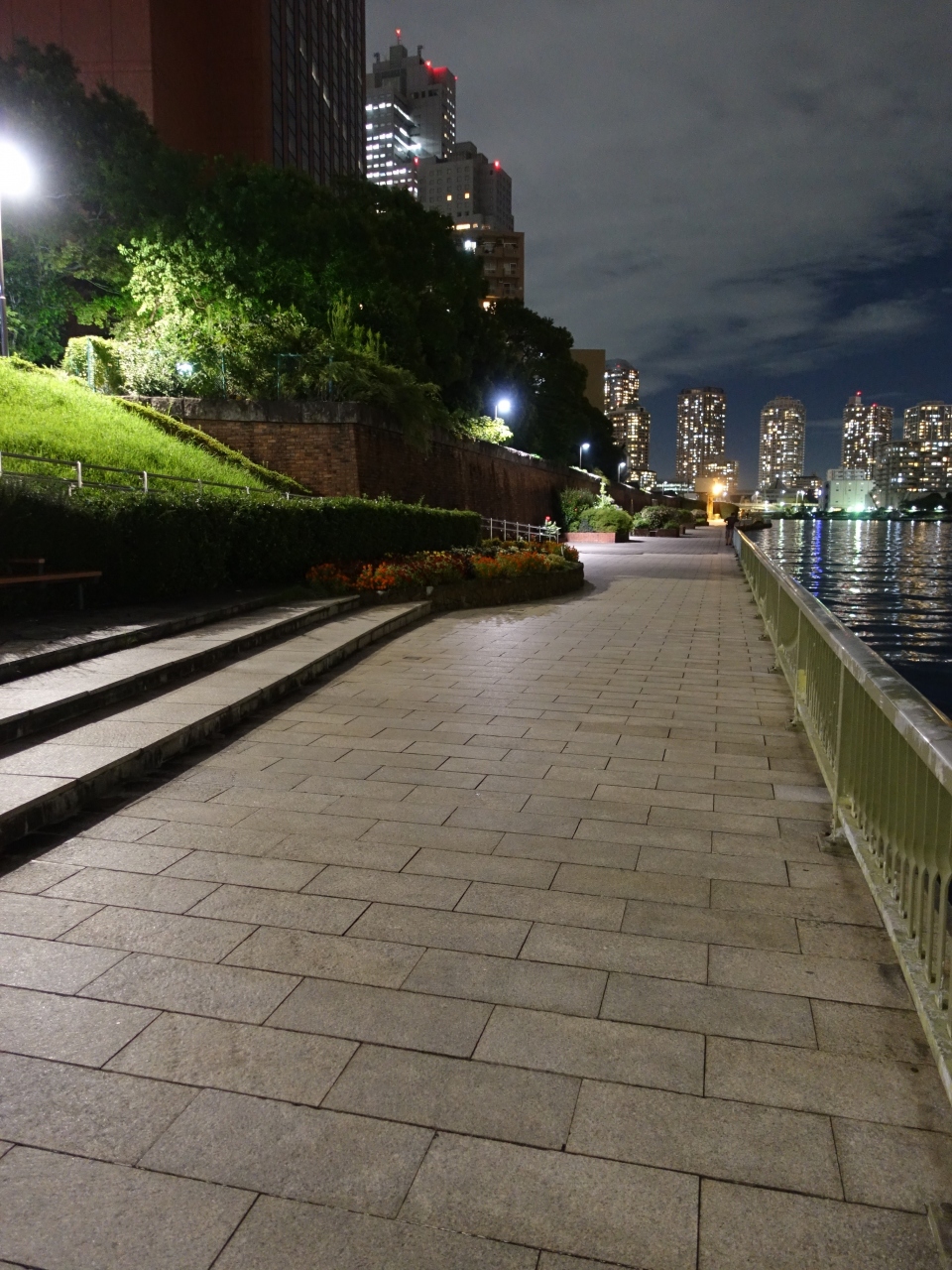 築地で夕食を終えたあと、隅田川まで足を運びました。勝どき橋の築地側のたもとにある「はとば公園」からは隅田川テラスに降りることが出来ます。人影はほとんどありませんでしたが、ジョギングをする人の姿が見られました。気温も下がり、月島の夜景を見ながらのランニングは、なかなか快適そうでした。
