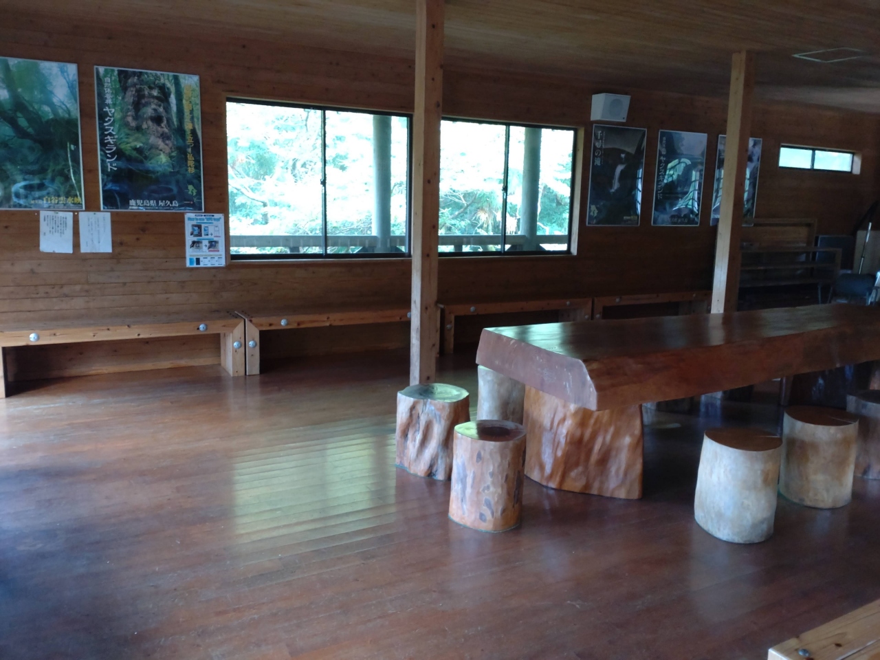 ヤクスギランド入口の道路の向かいにある施設です。売店があるようですが、閉まってました。2階はテーブルや椅子があり休憩ができます。ヤクスギランドにはトイレがないのでここを利用することになります。利用協力金100円が必要です。100円は1度でいいそうで、帰りの使用時は不要です。