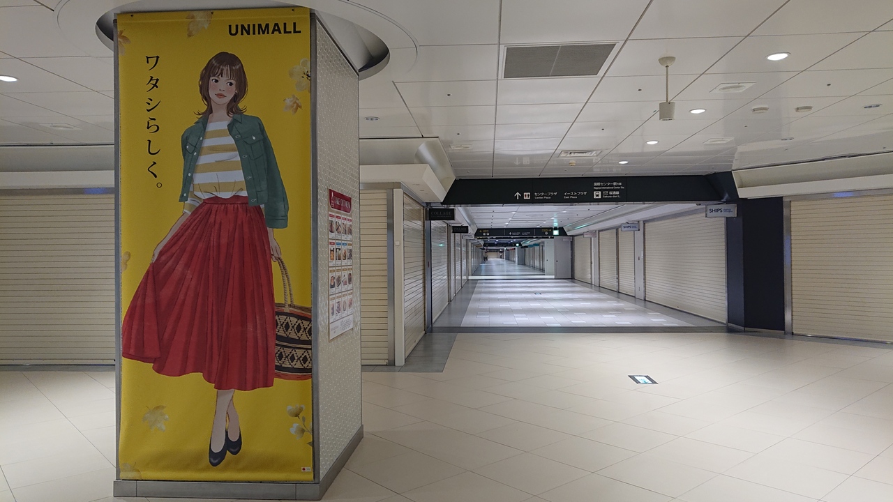 10月中旬に平日の、夜の時間帯に訪問しました。通行する人はいるものの、日中の、数多くのお店が営業している時間帯と比べると、人通りはまばらだった、と言っても過言でない位の状況でした。今回の訪問では、柱に記された、キャッチコピーの、「ワタシらしく。」との言葉が、多様なお店の立地するユニモールらしくて、印象に残りました。